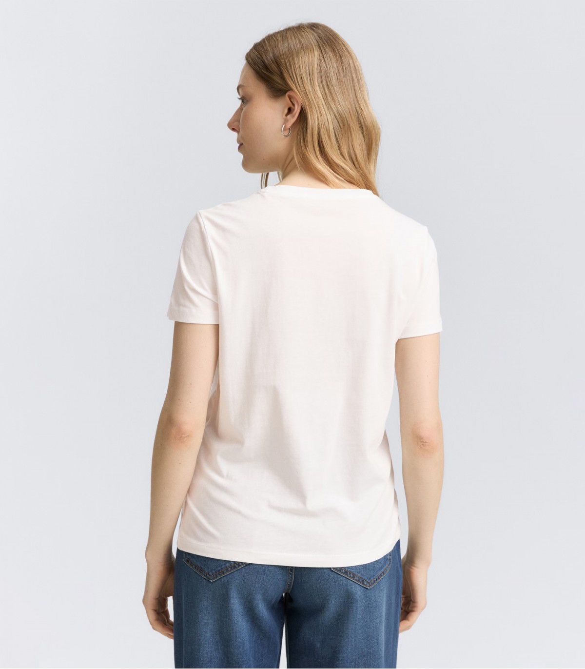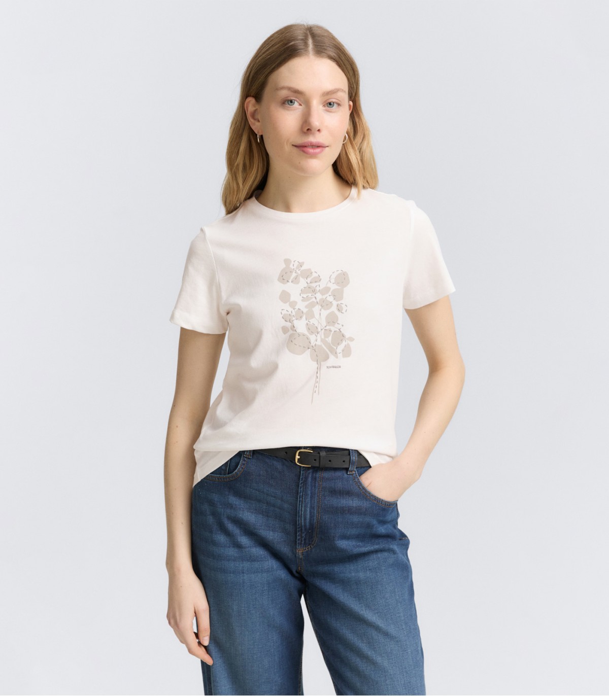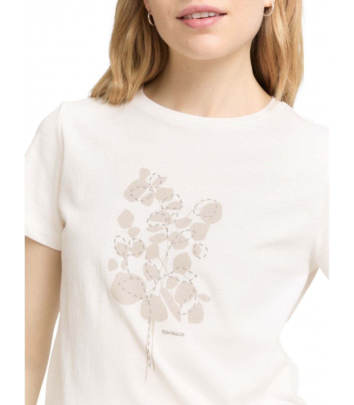 Moteriški „Tom Tailor“ marškinėliai trumpomis rankovėmis, apvalia iškirpte ir krūtinės raštu. Lengvi ir universalūs laisvalaikio stiliaus marškinėliai.