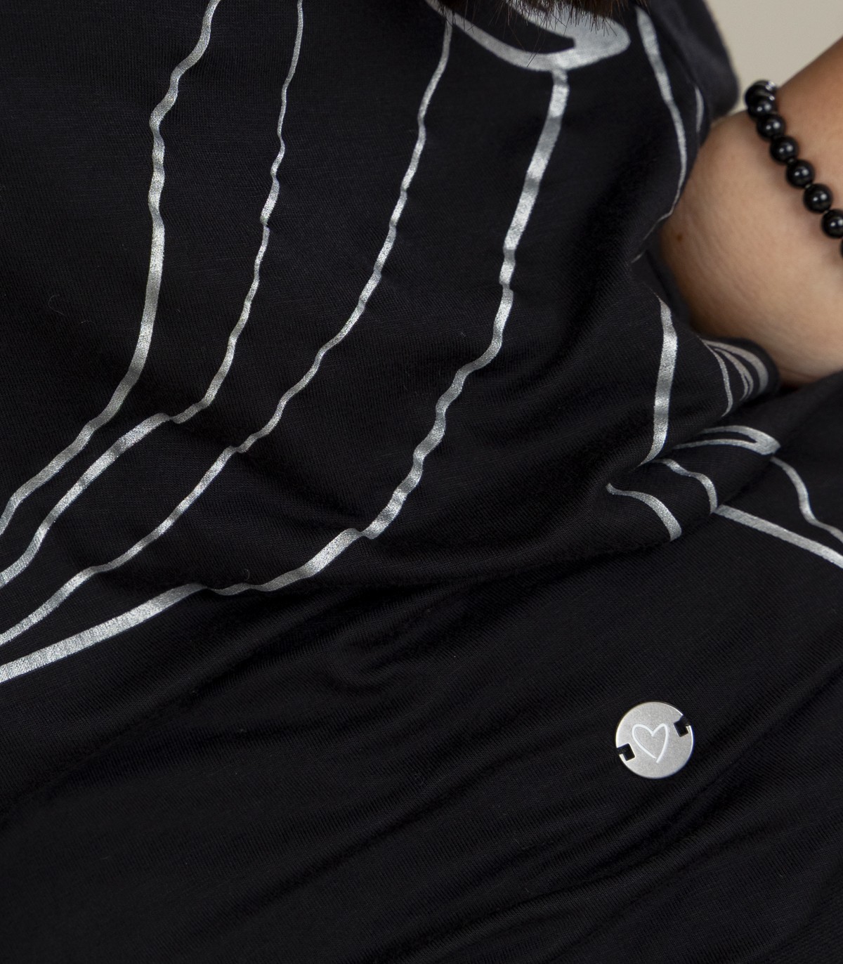 Juodi marškinėliai su balto lapo paveikslėliu. Patogus kirpimas ir trumpos rankovės puikiai tinka kasdieniam dėvėjimui.