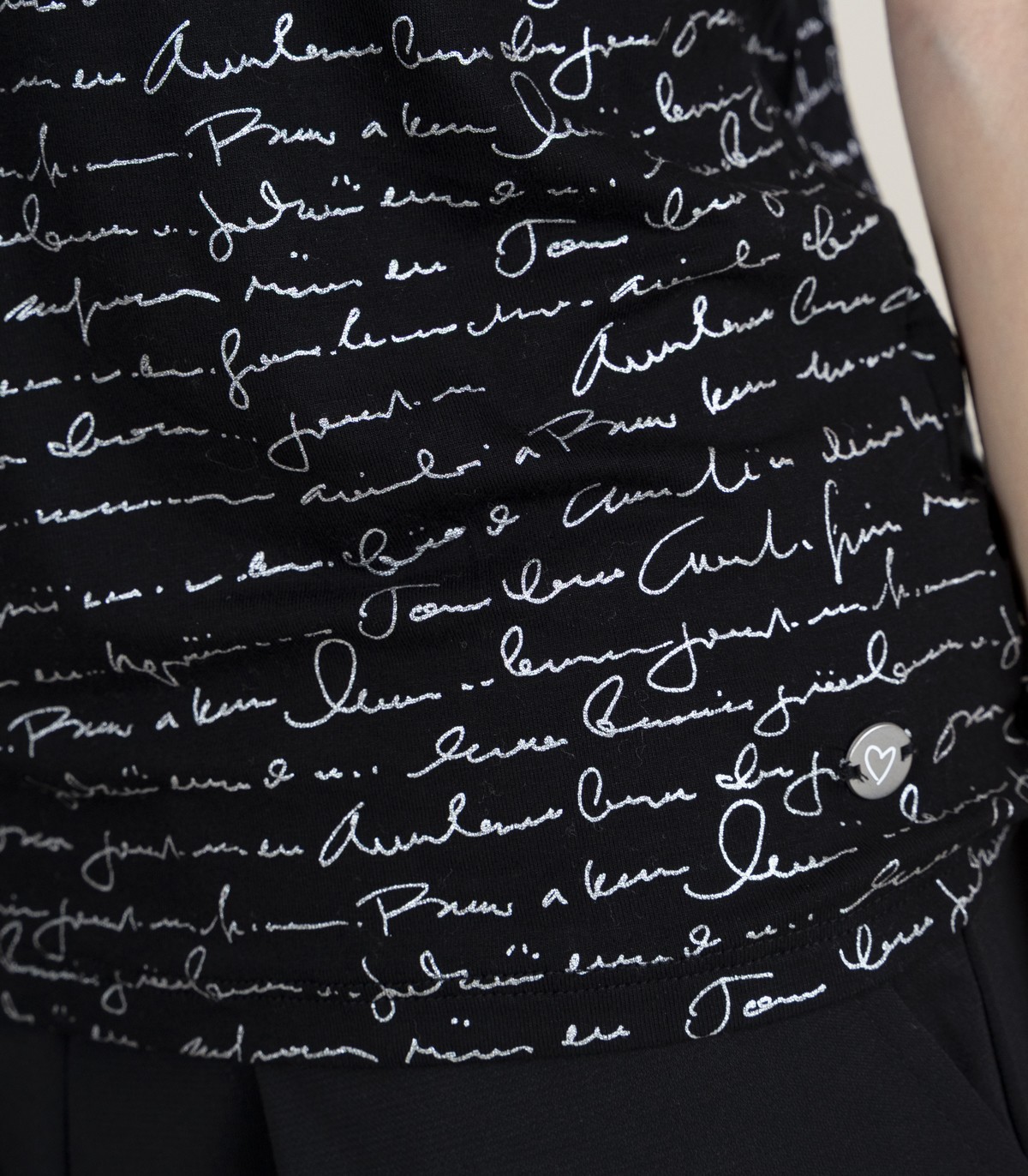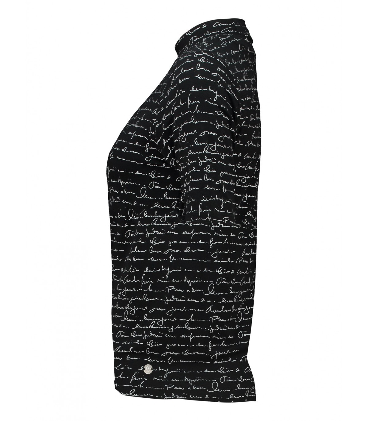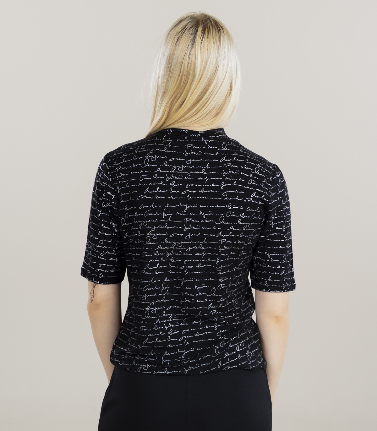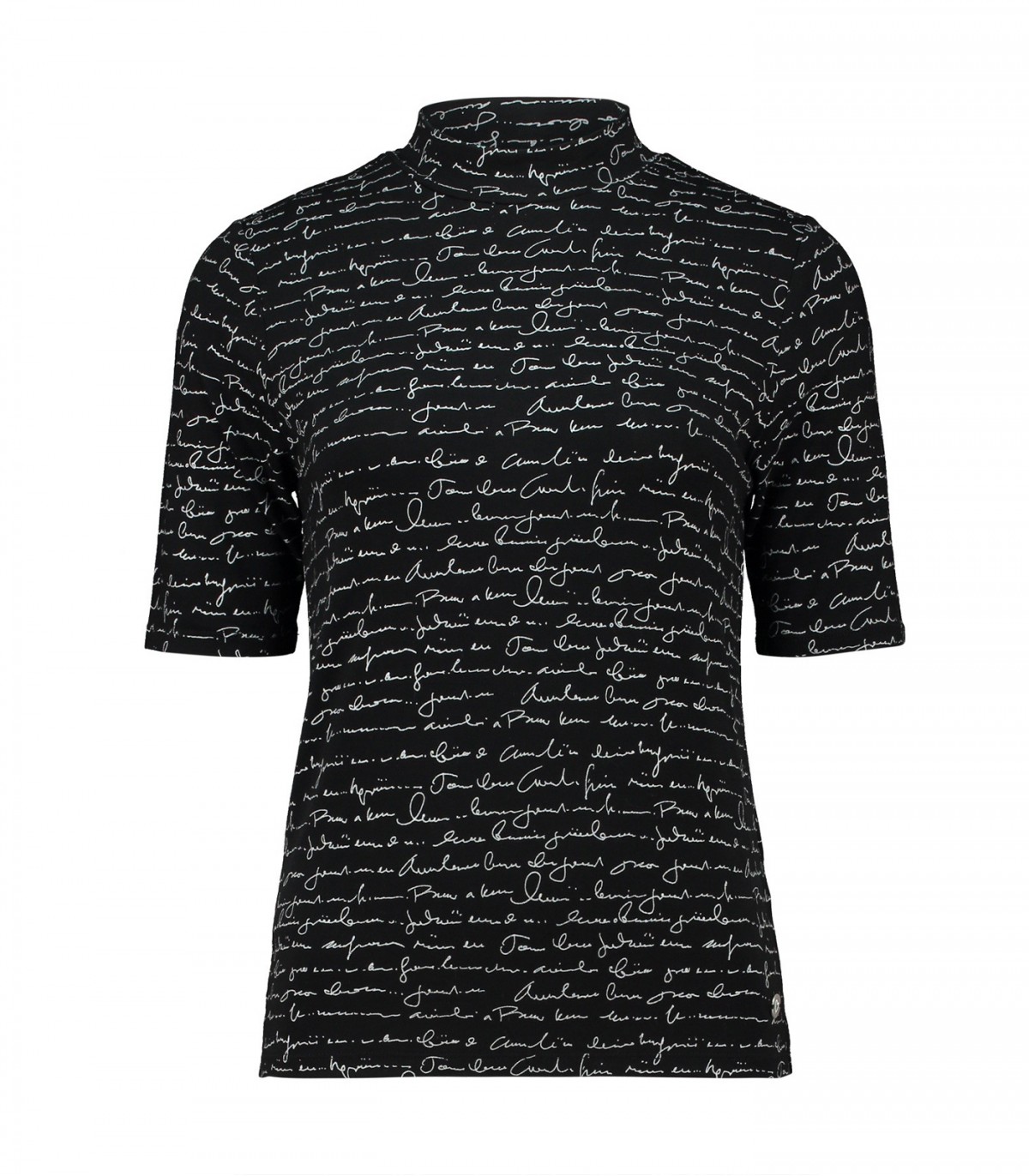 Šie marškinėliai su grafiniu raštu pasižymi golfo apykakle ir baltu užrašu juodame fone. Tamprus, minkštas audinys patogiai priglunda ir dera tiek su kelnėmis, tiek su sijonais.