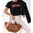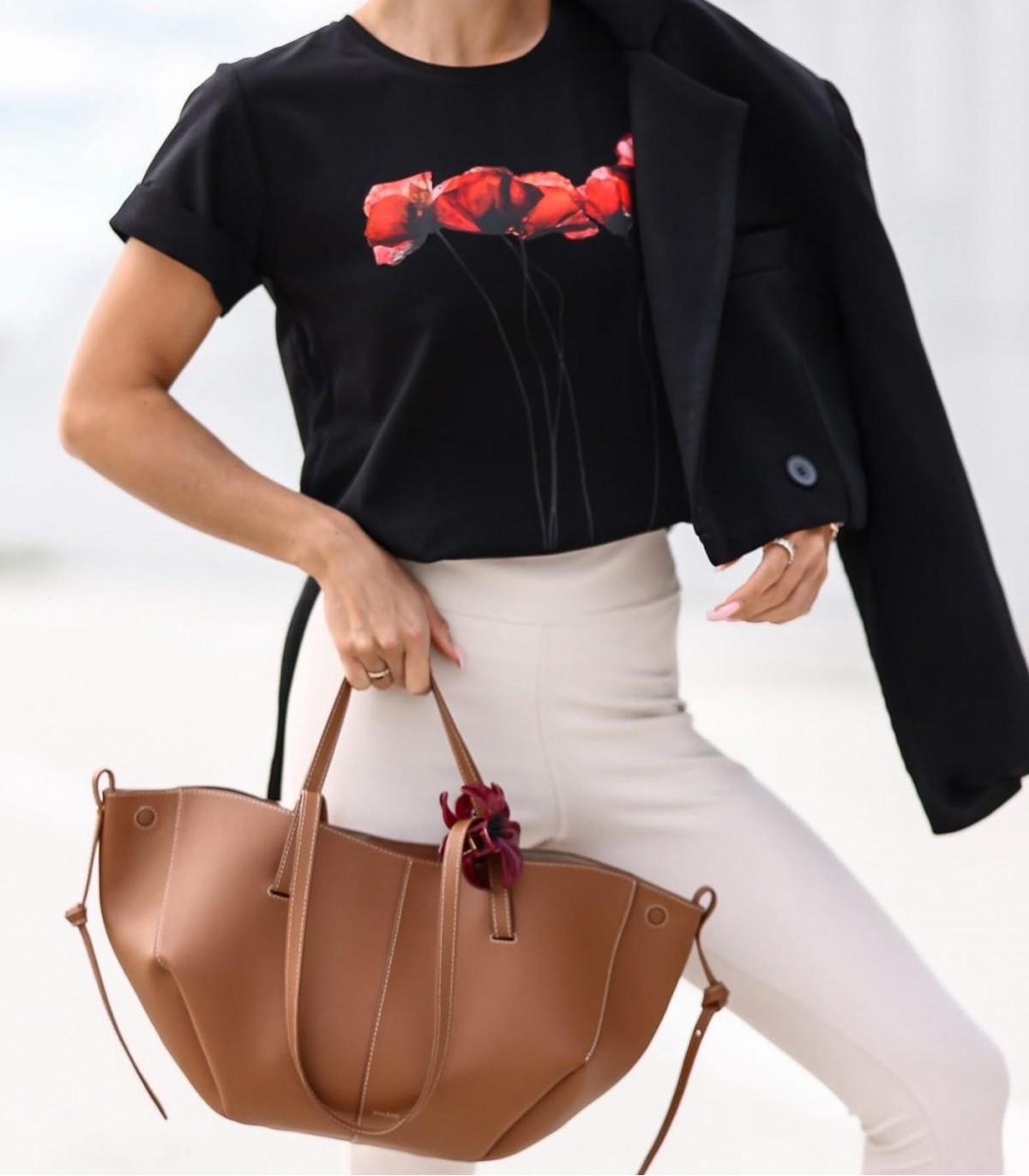 Šie moteriški marškinėliai yra apvalia apykakle ir trumpomis rankovėmis, kurias galima užraitoti. Priekyje yra madingas iliustruotas raštas. Minkštas, kvėpuojantis audinys užtikrina patogų dėvėjimą kasdien.