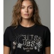 - „Guess“ logotipas ant krūtinės su dekoratyviniais elementais