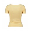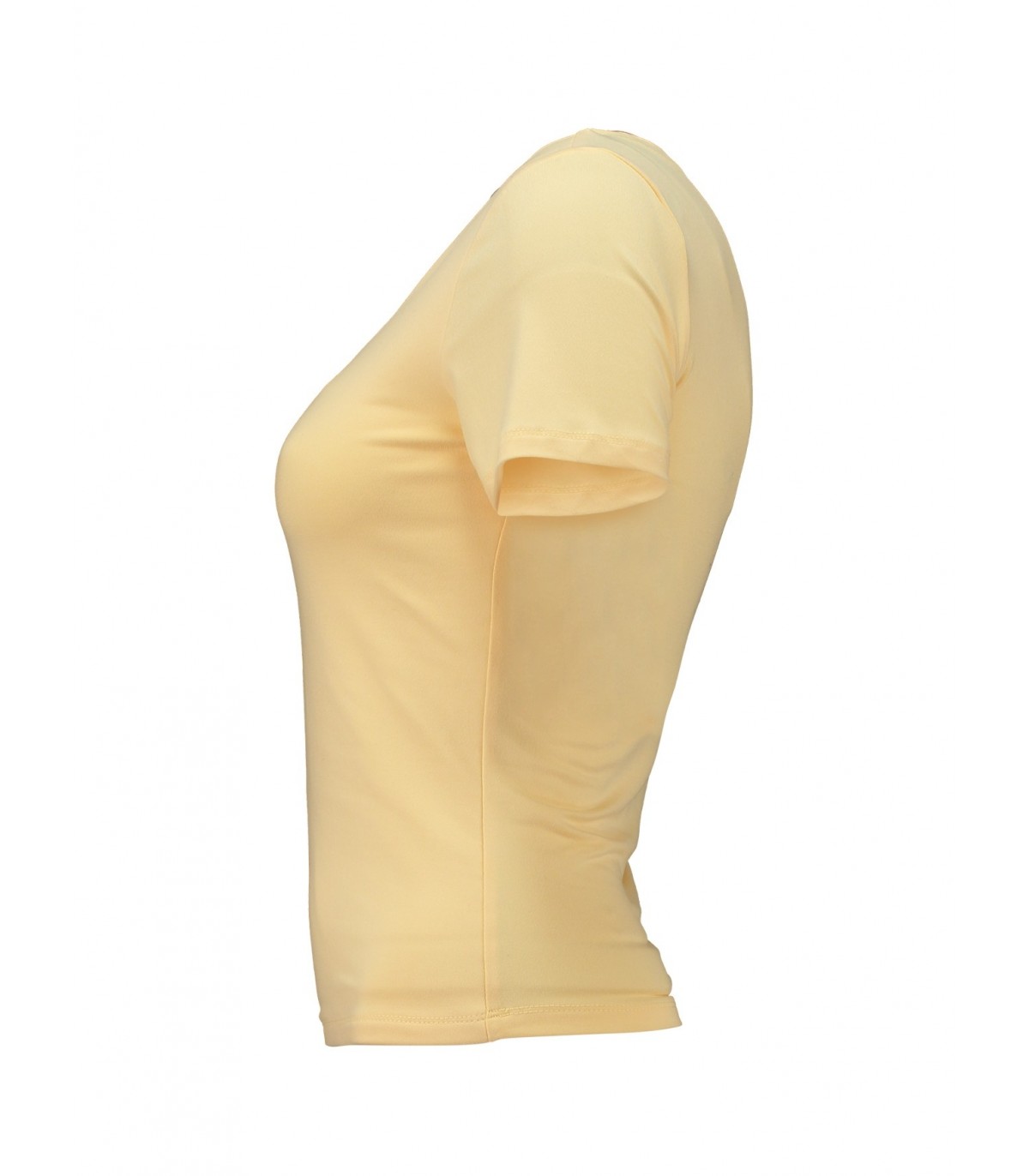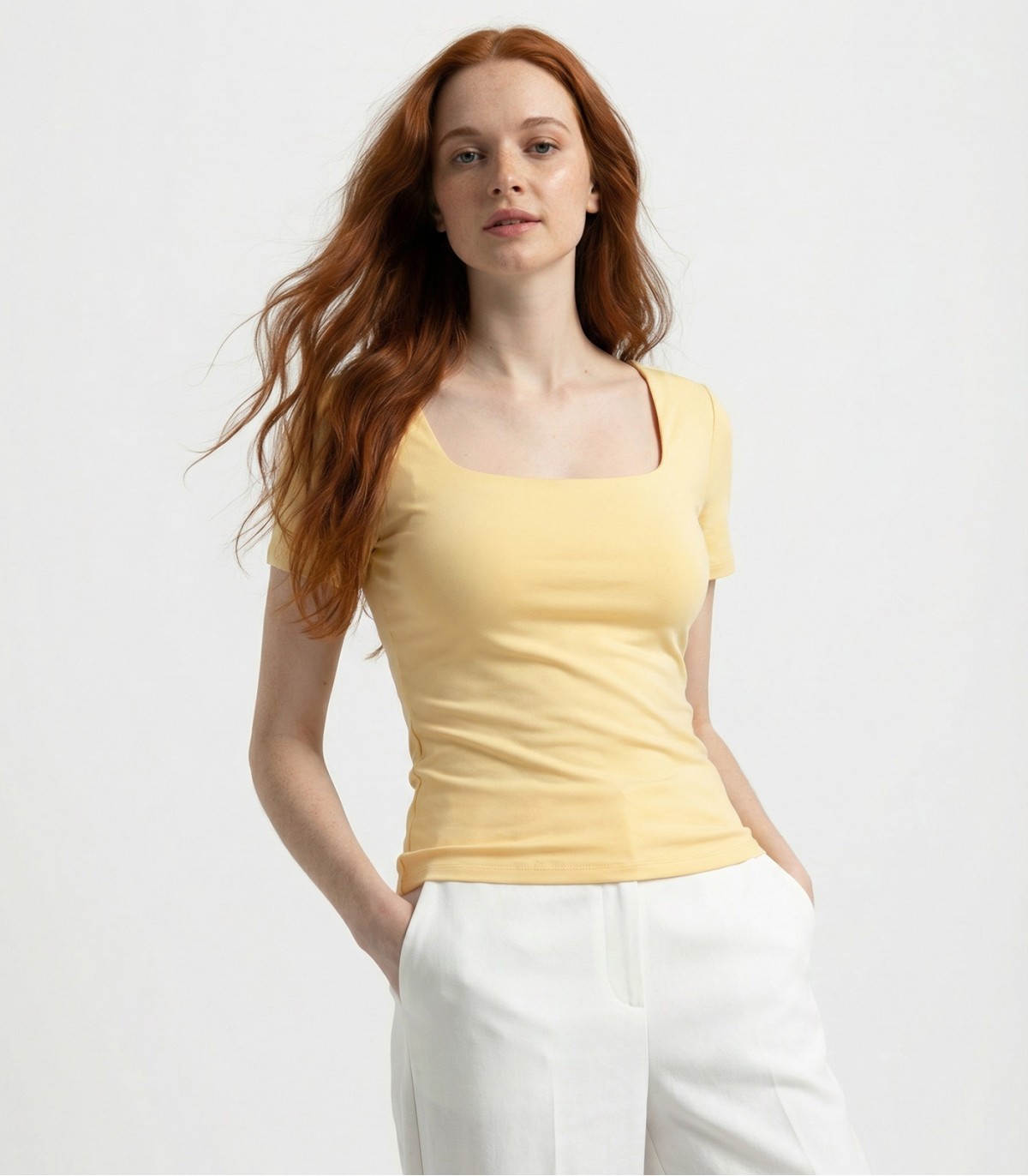 Šie moteriški marškinėliai pasiūti iš tampraus poliesterio ir elastano mišinio audinio ir yra prigludusio silueto. Trumpų rankovių modelis su kvadratine iškirpte paryškina dekoltė ir užtikrina patogų dėvėjimą. Jie puikiai tinka tiek laisvalaikiui, tiek stilingam įvaizdžiui.