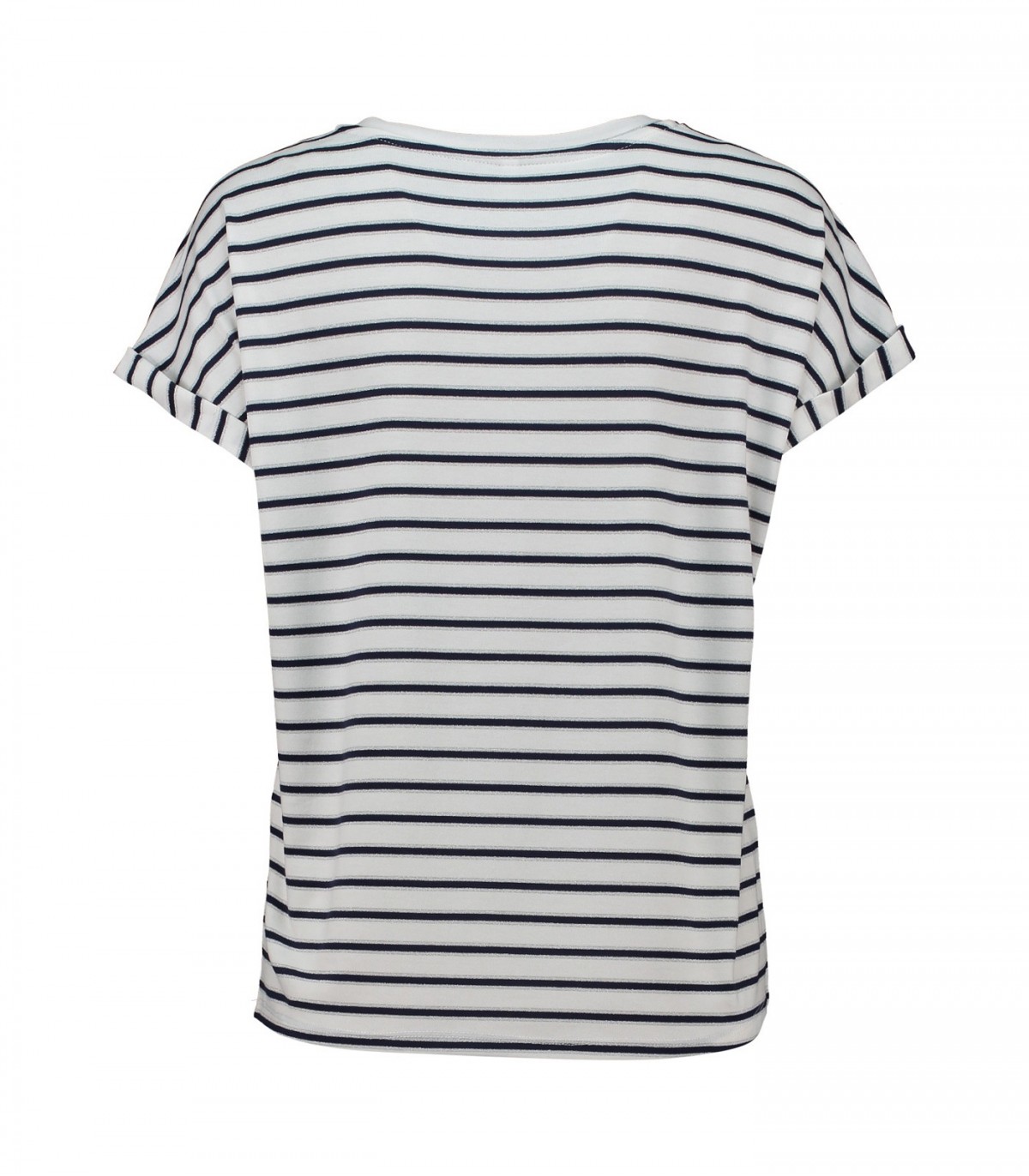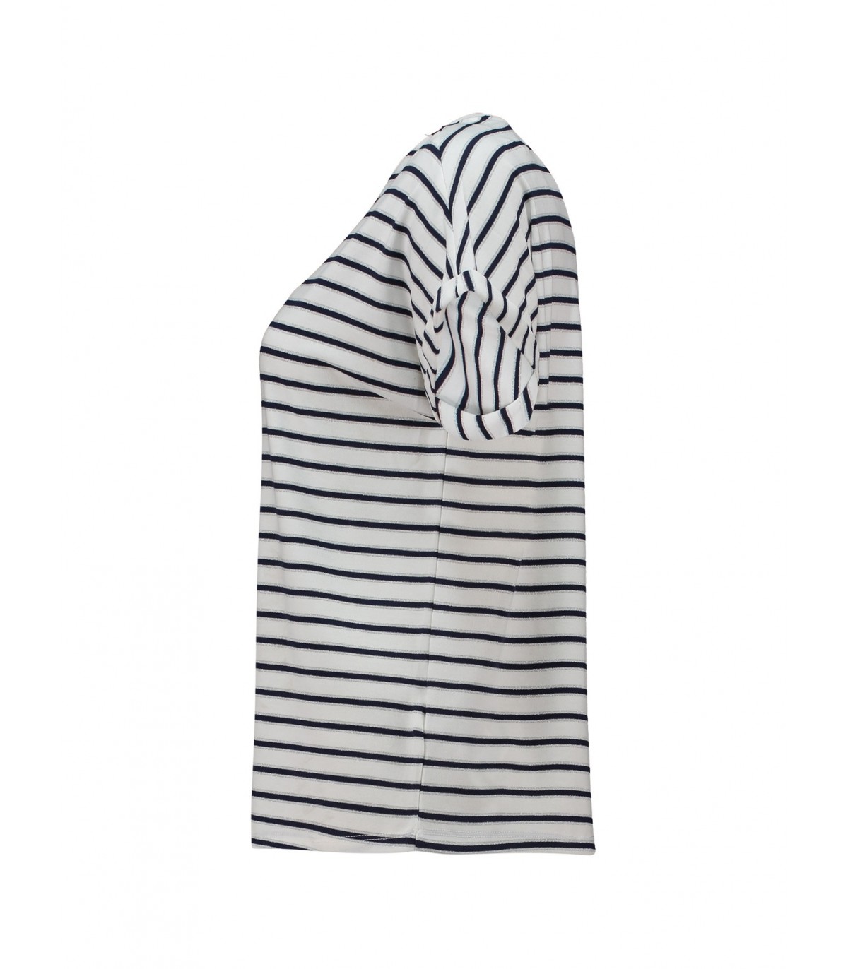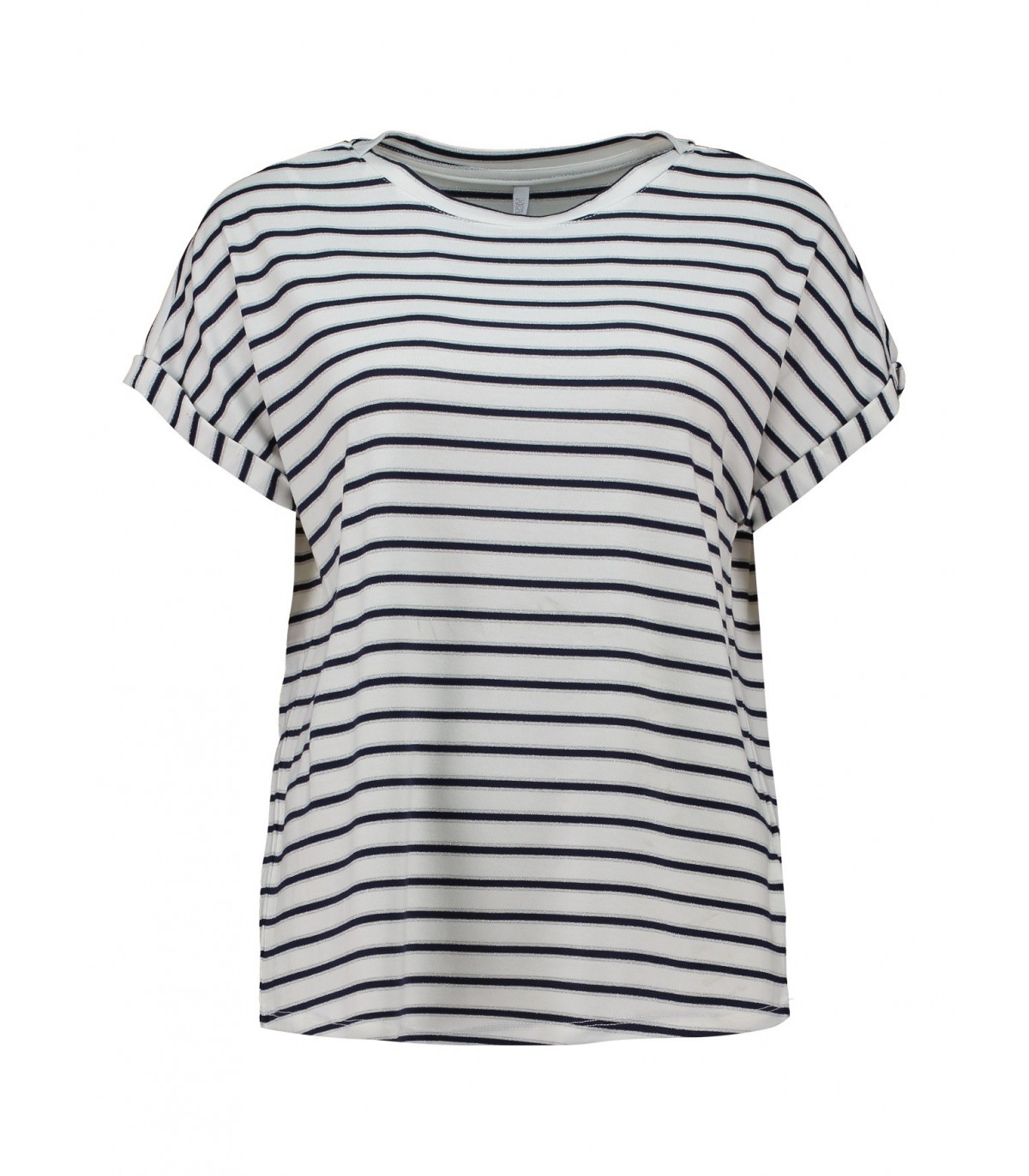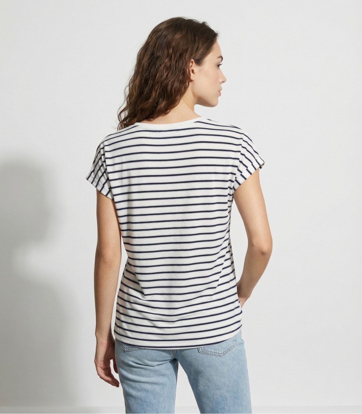 Šie moteriški marškinėliai su klasikiniu mėlynos ir baltos spalvos dryžių raštu yra pasiūti iš minkšto, patogaus audinio. Trumpos, nuleistos rankovės su rankogaliais ir laisvas kirpimas sukuria lengvą, kasdienį įvaizdį, puikiai tinkantį kasdieniam dėvėjimui.