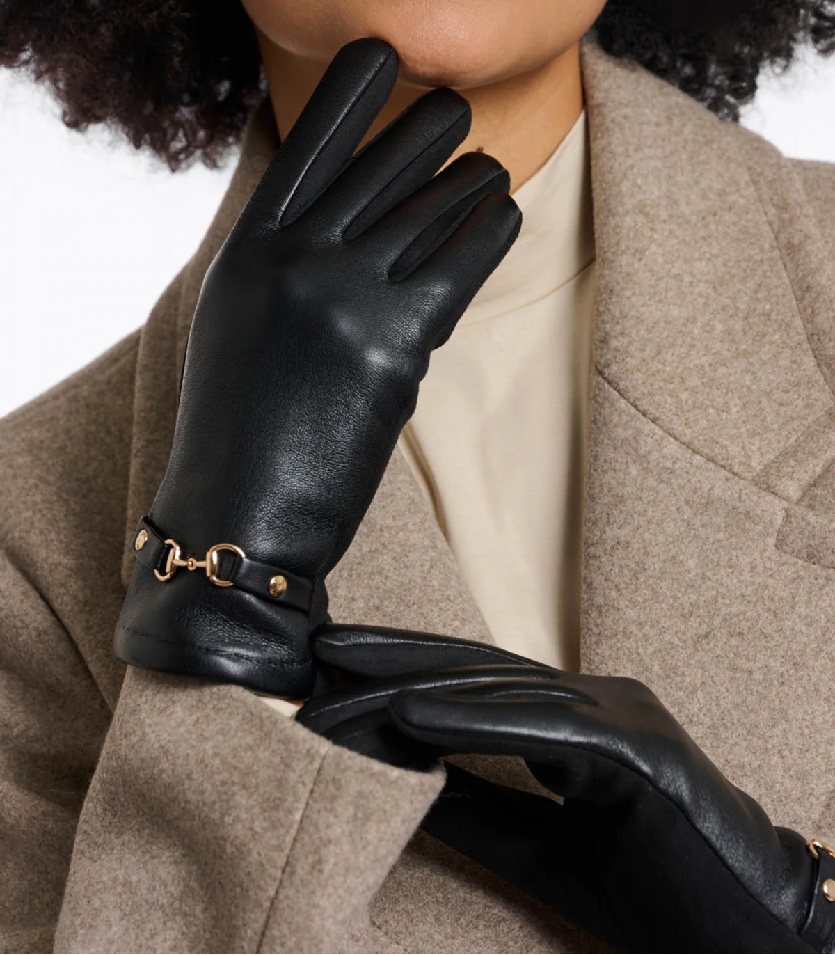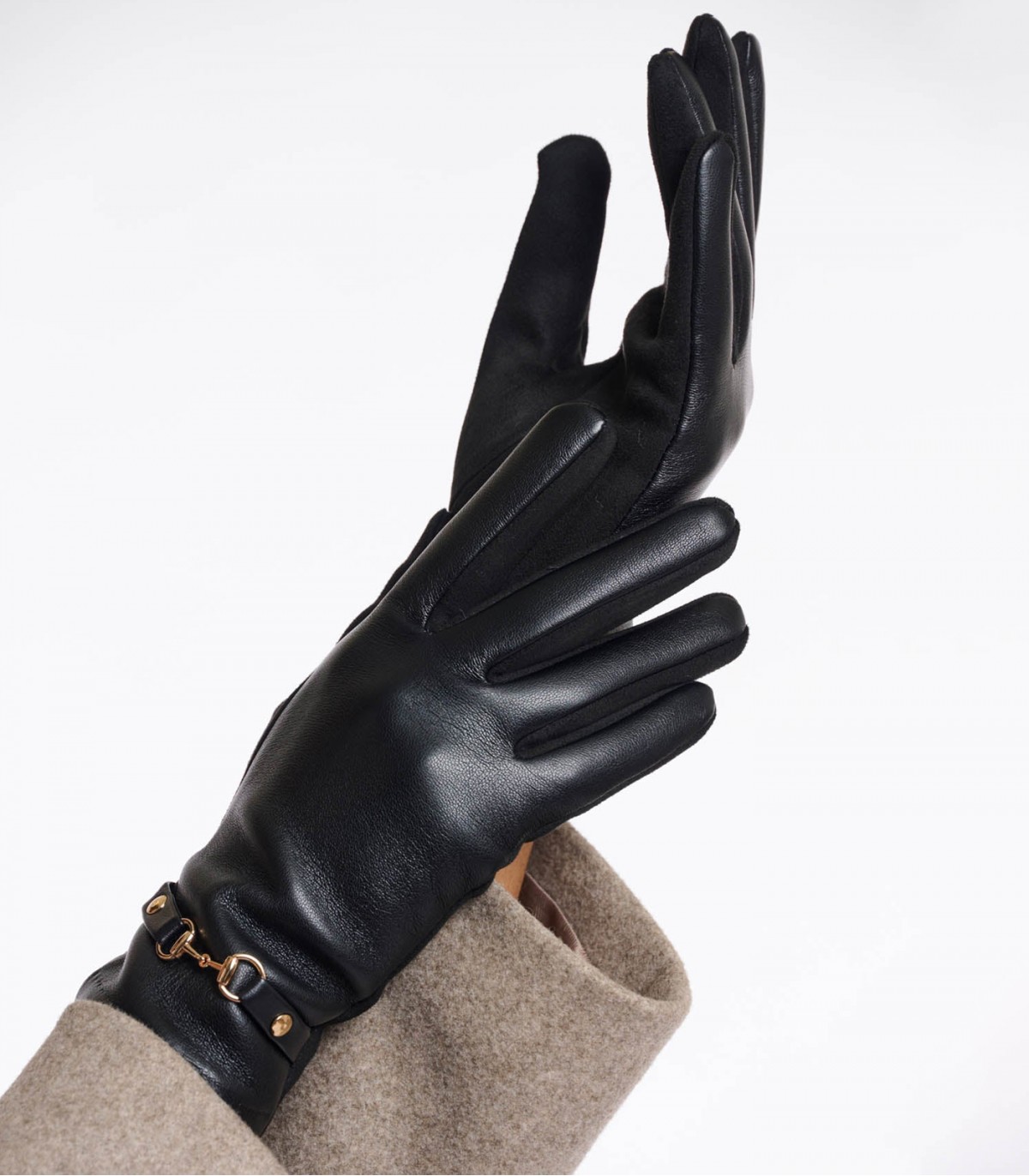 Elegantiškos dirbtinės zomšos pirštinės su lygiomis dirbtinės odos apdailos detalėmis. Viduje pamušalas minkštas dirbtinės zomšos pamušalas, užtikrinantis šilumą ir komfortą. Moteriškos aukso spalvos detalės.