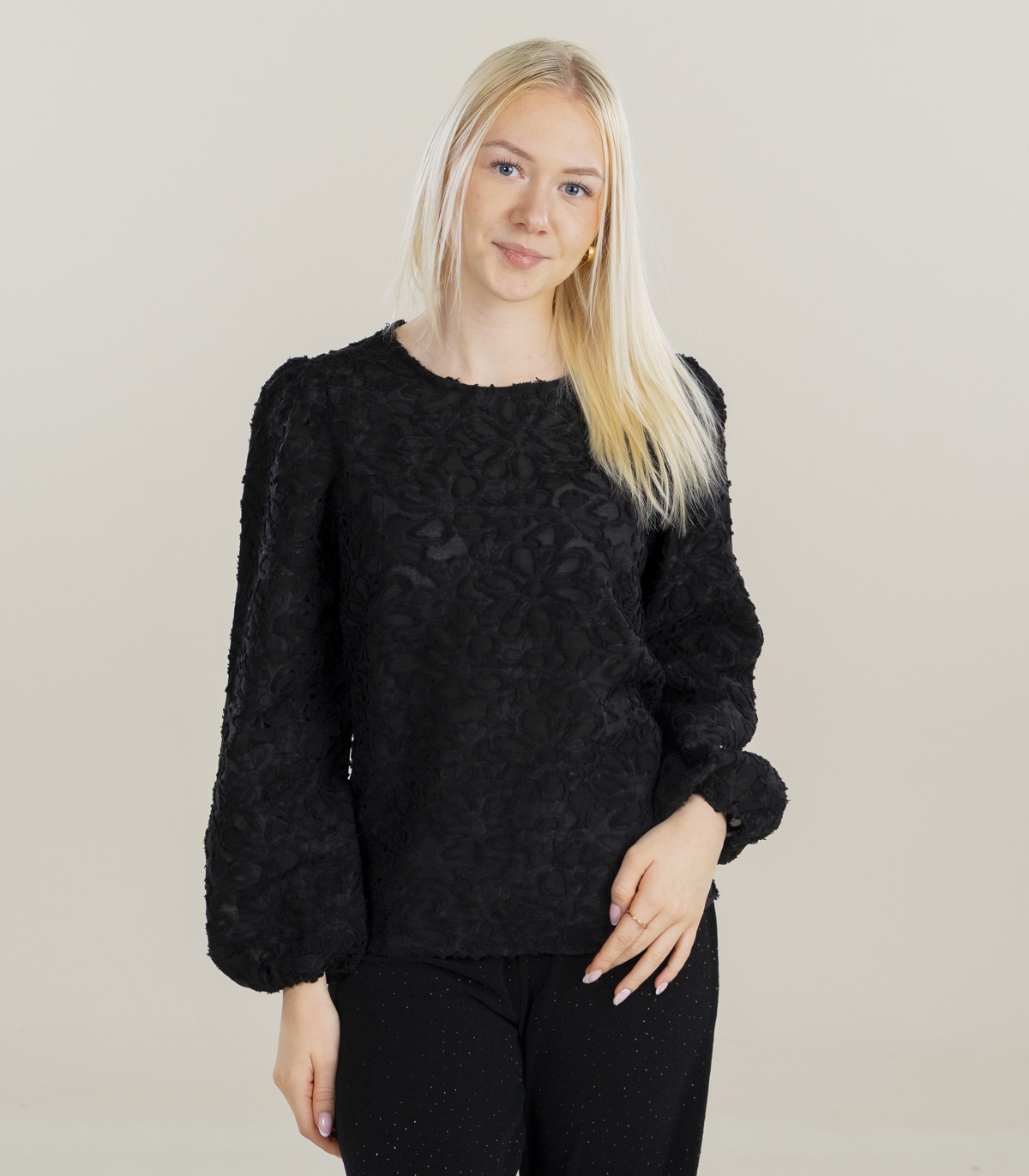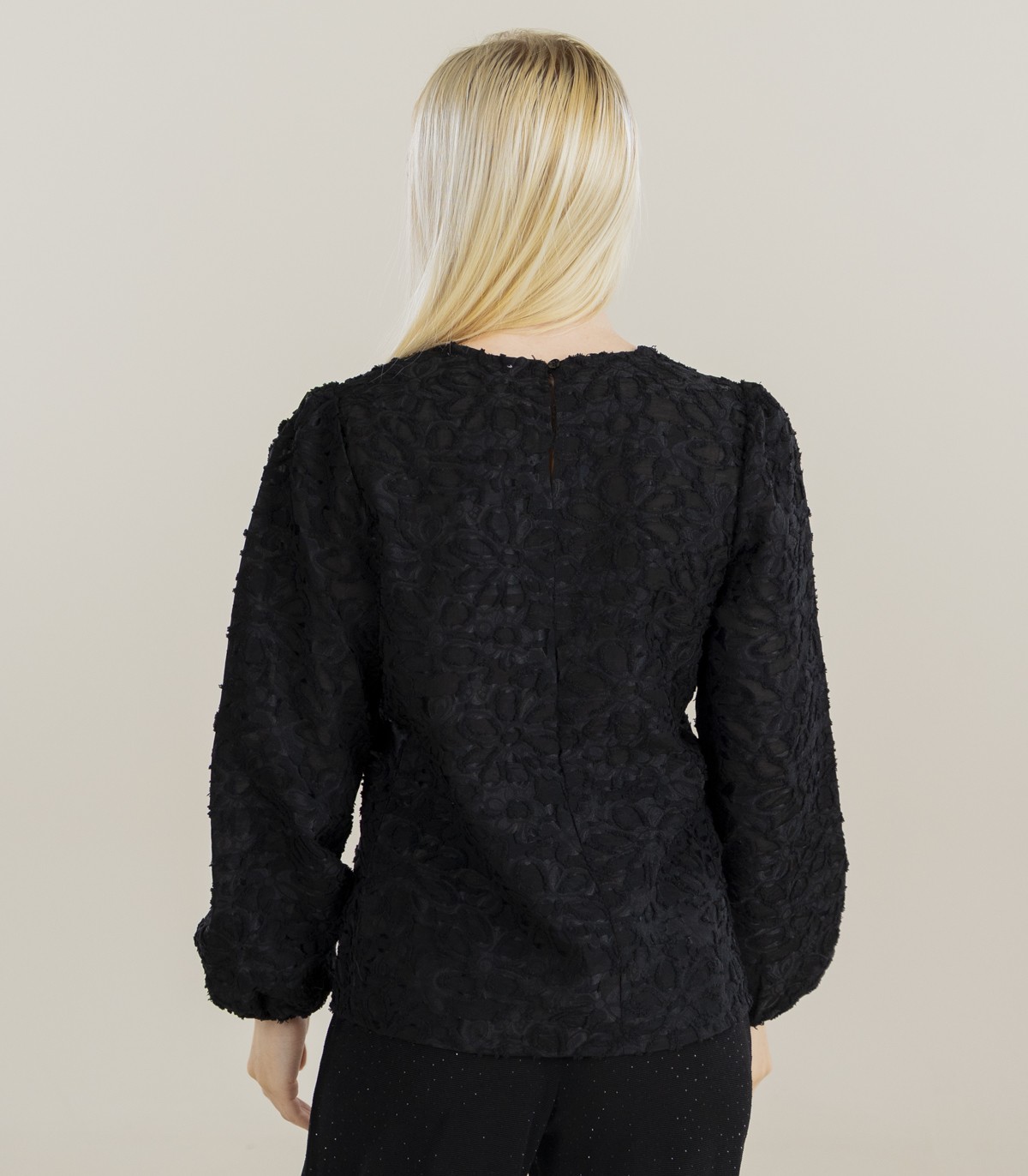 Moteriška palaidinė „Hailys“ pasiūta iš minkšto buklė audinio, kuriame dera patogumas ir elegancija. Apvali apykaklė ir užsegimas sagomis nugaroje sukuria tvarkingą siluetą, o ilgos, pūstos rankovės suteikia moteriškumo ir apimties.