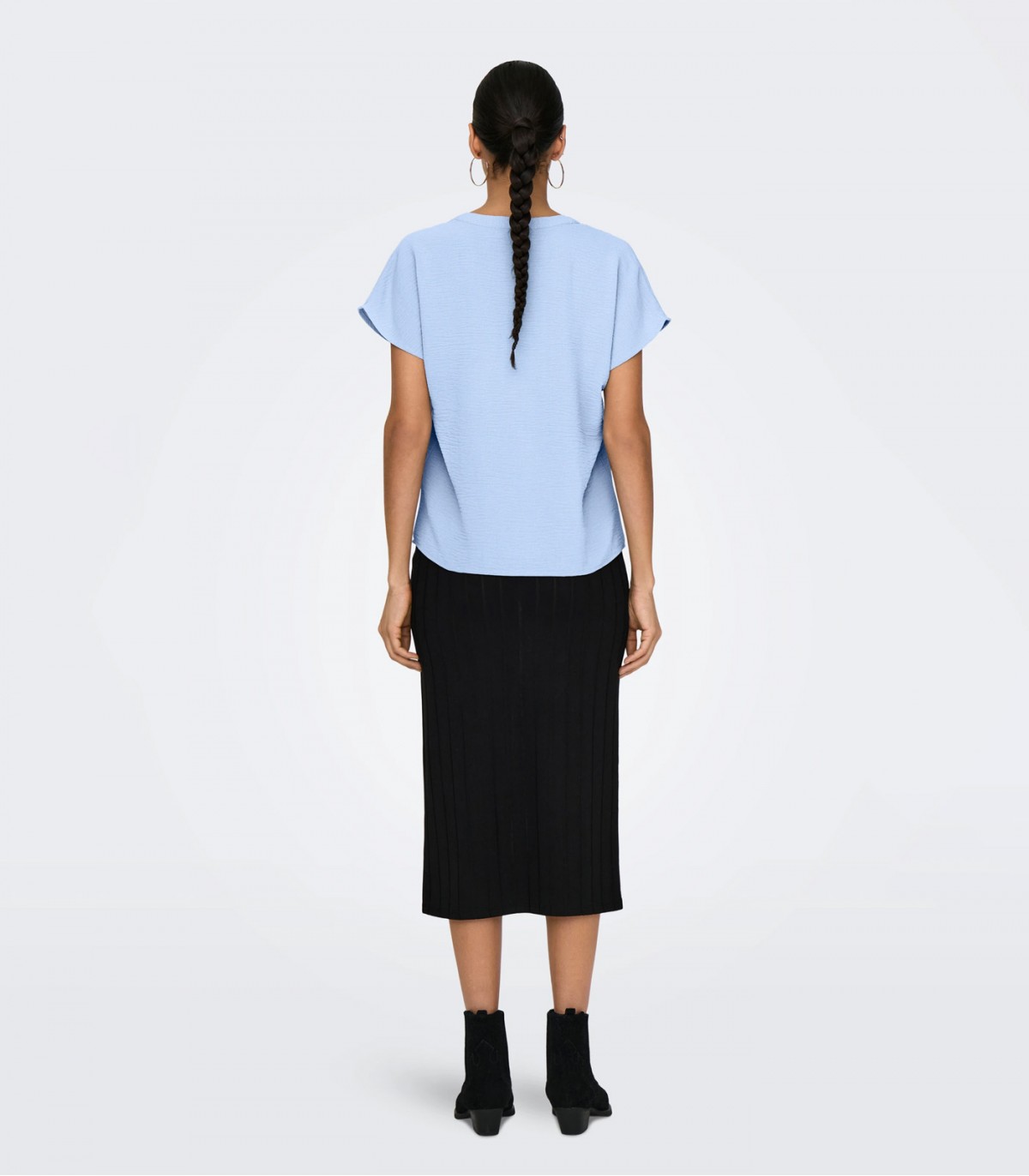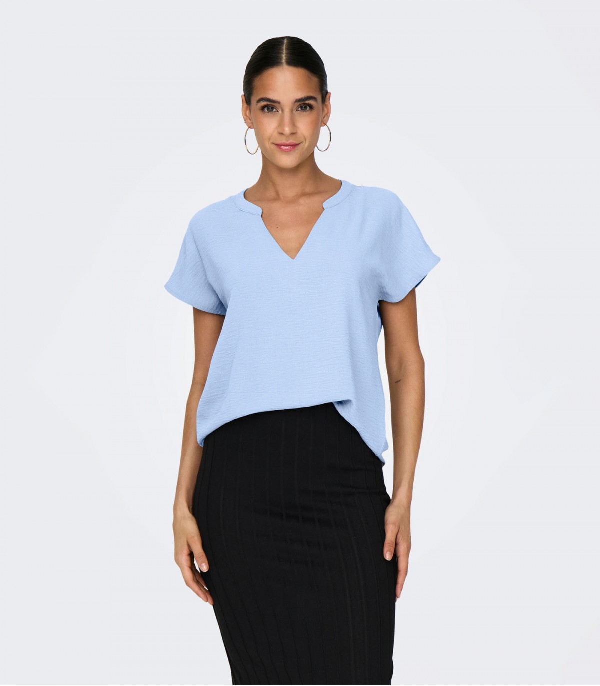 Ši lengva moteriška palaidinė su V formos iškirpte yra pagaminta iš lengvai suglamžytos medžiagos, kuri suteikia daiktui kasdieniškumo ir stilingumo. Nuleistos rankovės suteikia išvaizdai švelnumo ir komforto, sukuria lengvumo ir elegancijos pojūtį. Šis modelis puikiai tinka kurti tiek kasdienius, tiek įmantresnius derinius.
