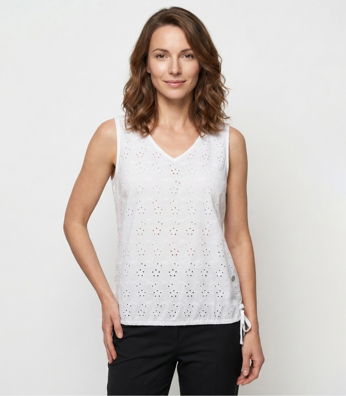 Šie lengvi ir kvėpuojantys moteriški marškinėliai puikiai tinka šiltesnėms dienoms ir lengvai dera prie įvairių aprangos elementų. Lengvas raštas ir paprastas kirpimas sukuria subalansuotą, vasarišką įvaizdį.
