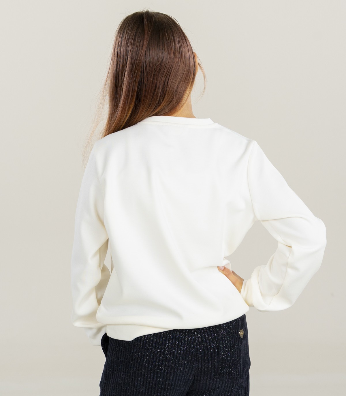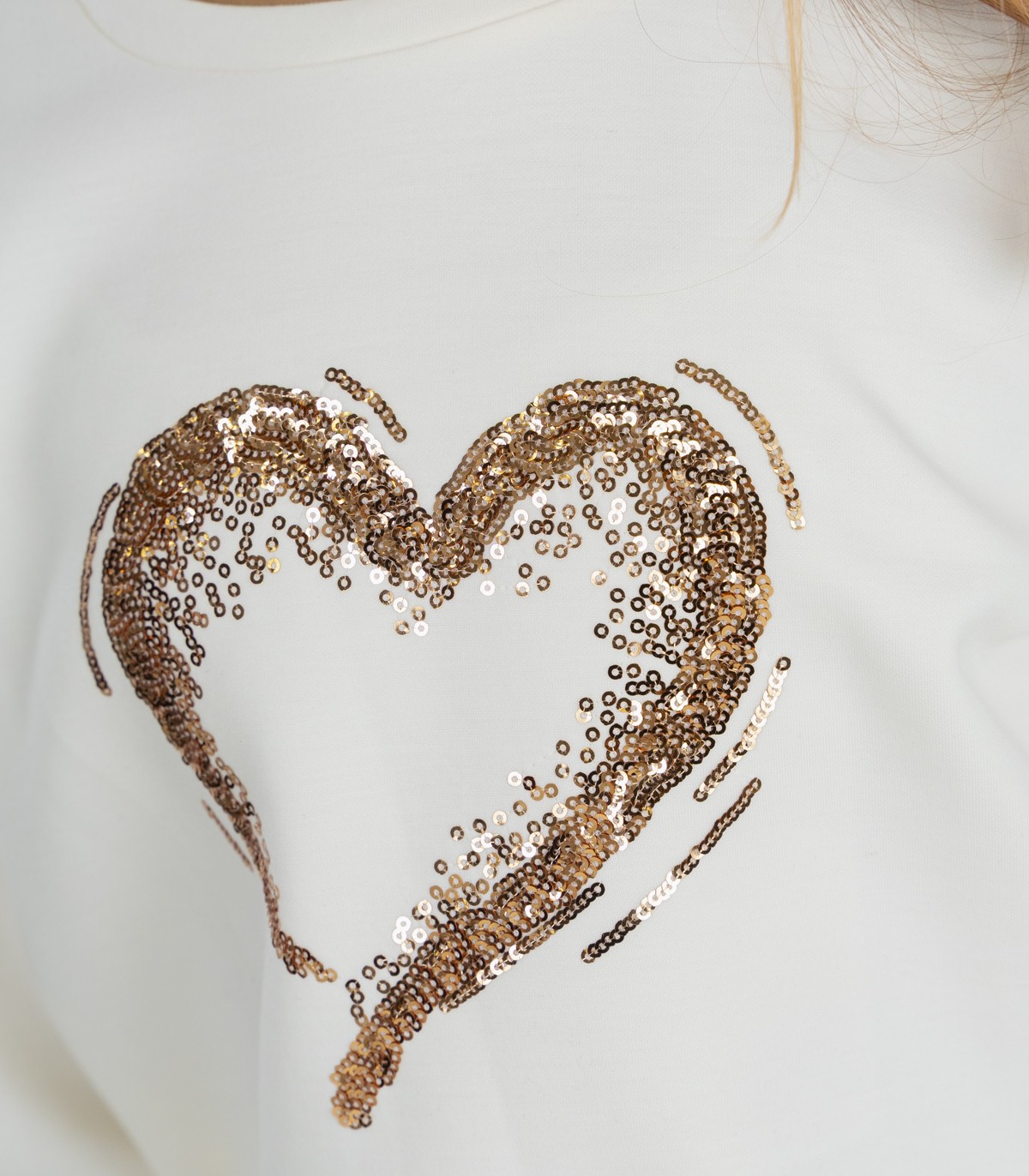 Mergaitiškas džemperis su auksiniais blizgučiais širdies formos priekyje – puikiai tinka kasdieniam dėvėjimui. Ryškus auksinis raštas suteikia gaminiui žaismingumo ir originalumo. Džemperį lengva derinti su džinsais, sijonais ar tamprėmis, sukuriant madingą kasdienį stilių.