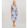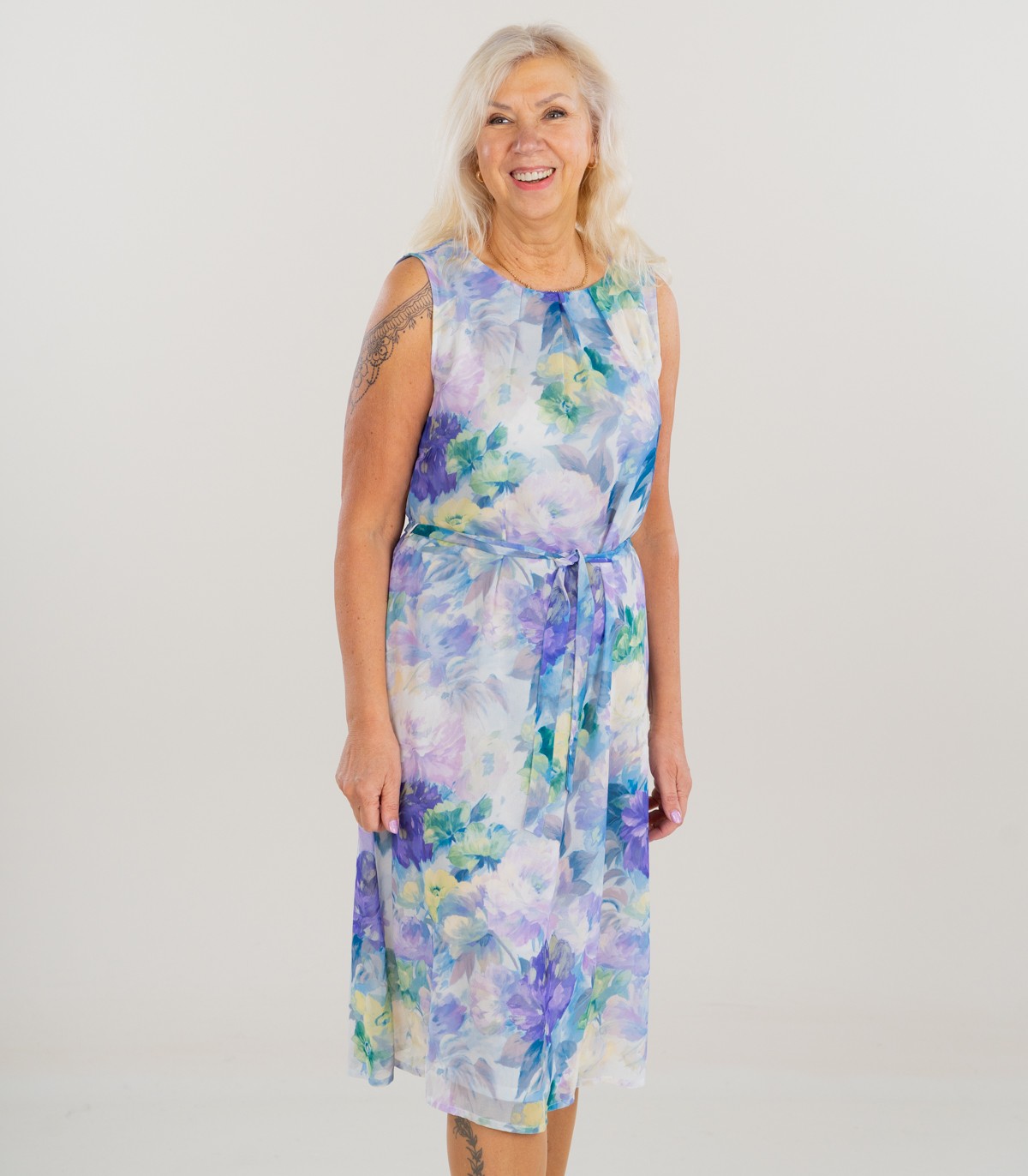 Lengva suknelė be rankovių, pasiūta iš erdvaus audinio. Gėlių raštas ant išorinio audinio suteikia romantiškumo, o lygus pamušalas suteikia komforto. Plonas audinio diržas pabrėžia juosmenį.