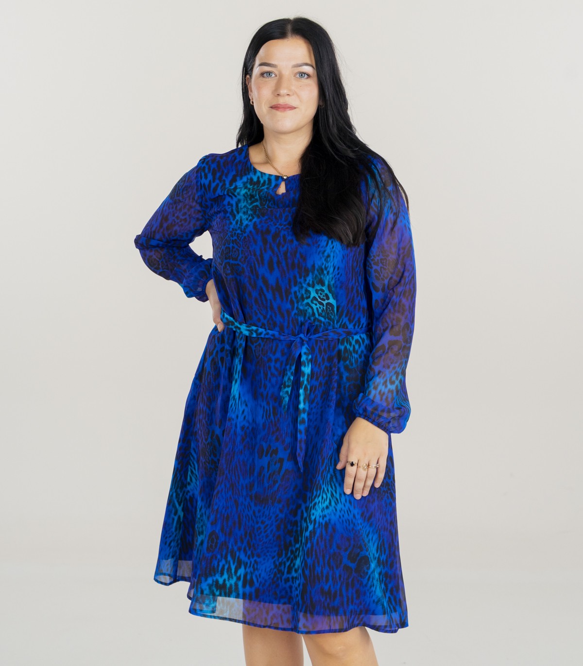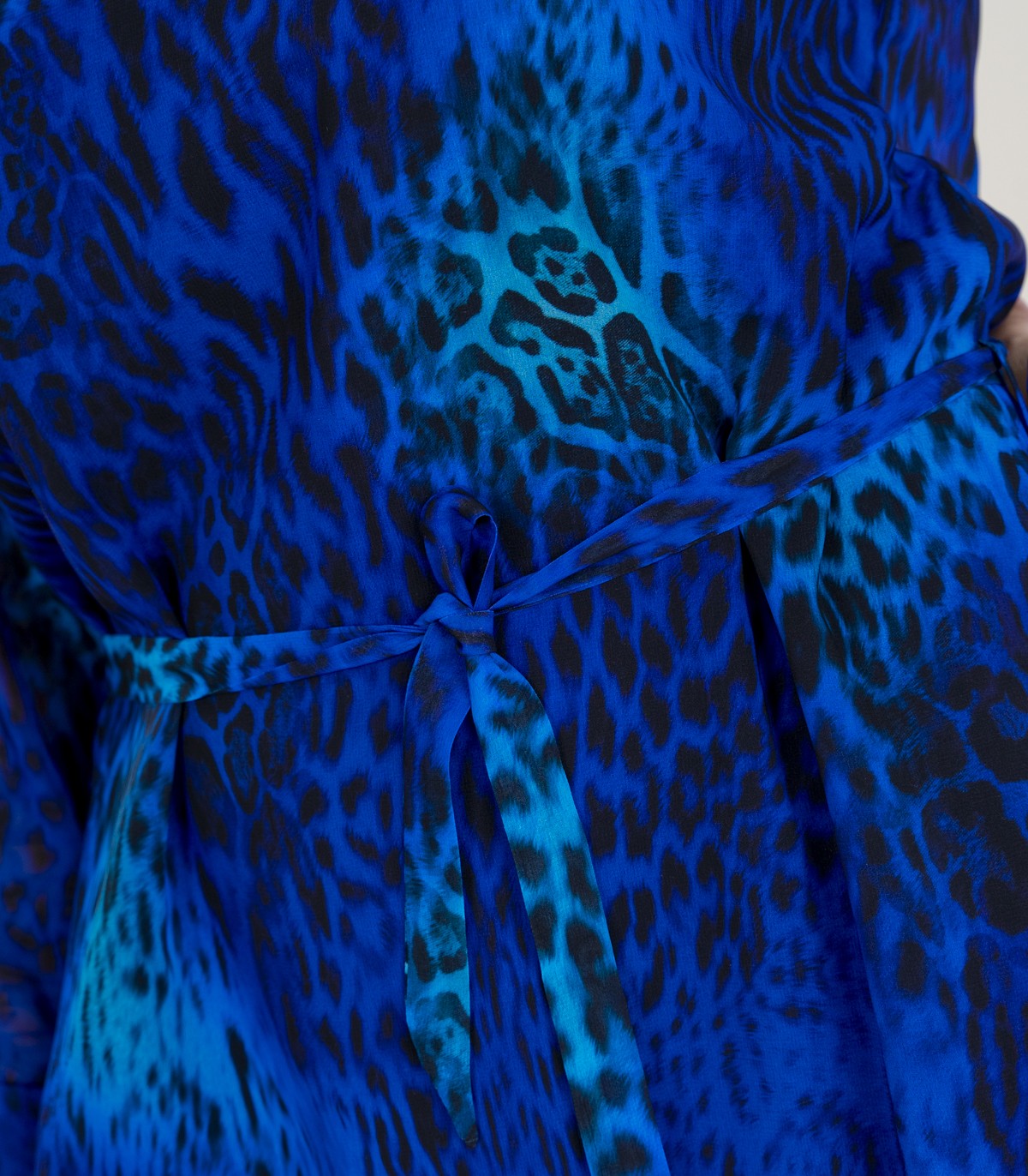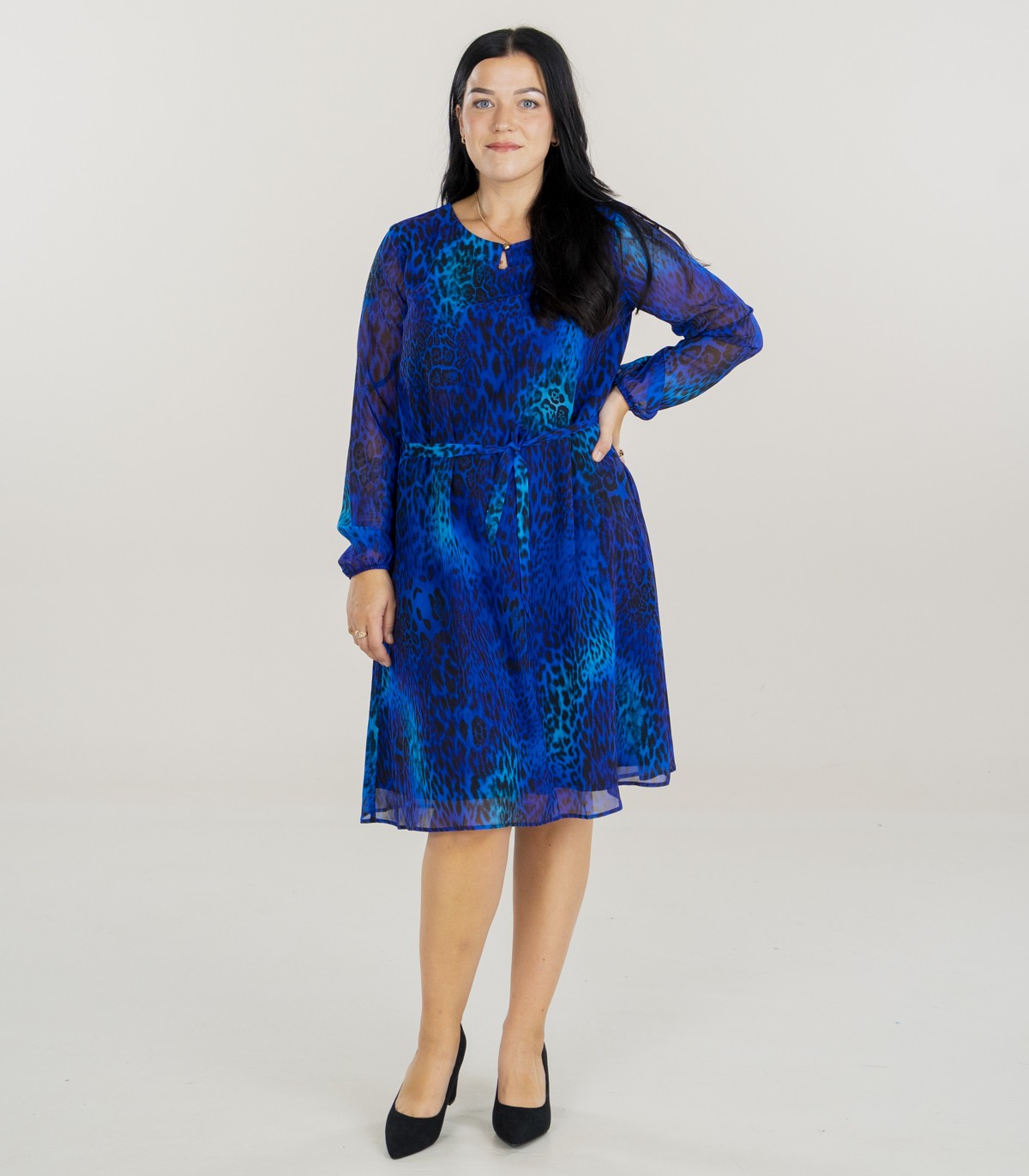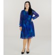 Ryški ir moteriška suknelė su mėlynu raštu. Šviesus šifono audinys ir gyvūnų raštai sukuria ypatingą įvaizdį. Liemuo surišamas juostele.
