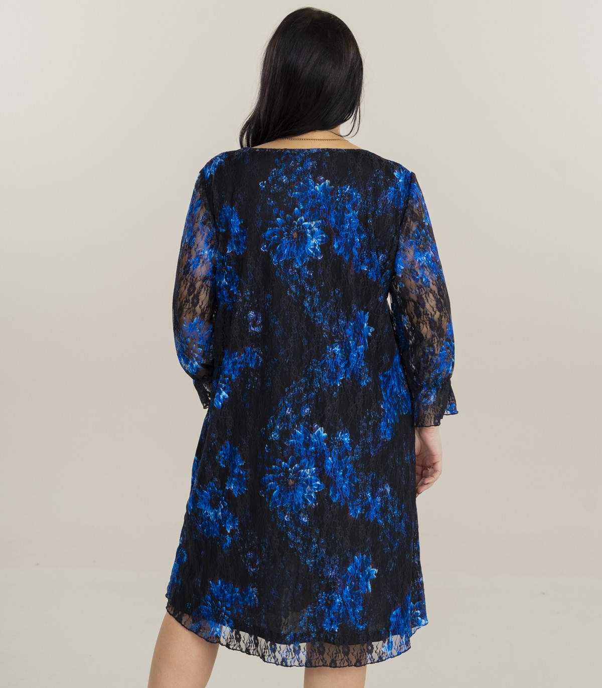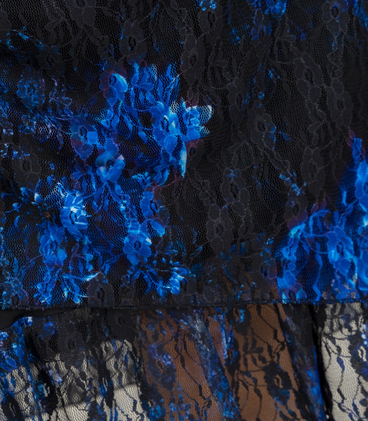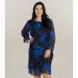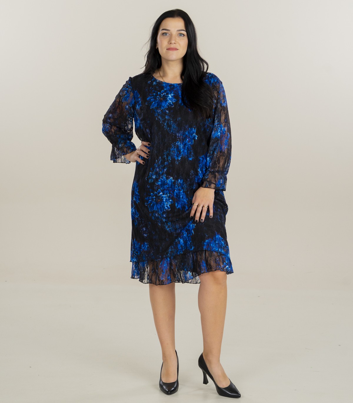 Sluoksniuota nėriniuota suknelė su mėlynais gėlių raštais ant juodo pagrindo. Tiesaus kirpimo, apvalia iškirpte ir ilgomis, kiek permatomomis rankovėmis. Apačią puošia subtilūs, moteriški raukiniai.