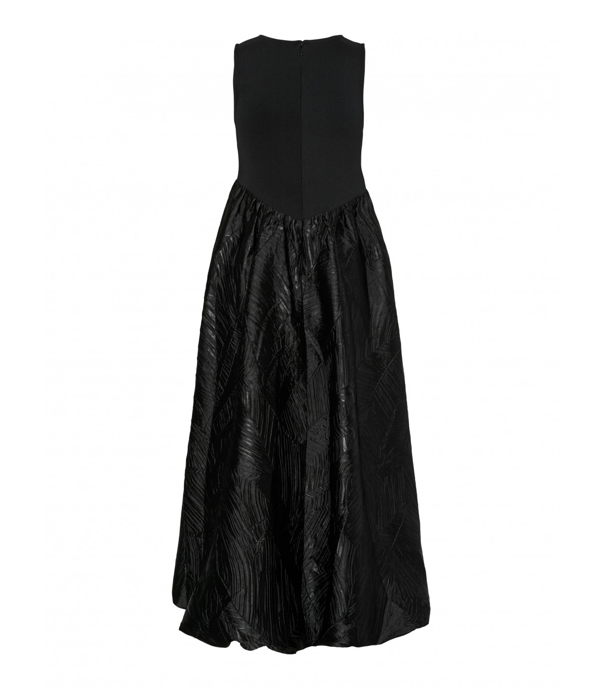 Elegantiška juoda suknelė su paprastu viršumi ir unikaliu, šiek tiek žvilgančiu sijonu. Ši maksi ilgio suknelė yra klasikinio kirpimo, puikiai tinkanti tiek oficialiems renginiams, tiek vakariniams susibūrimams. Audinys gražiai apgaubia figūrą, judant sukurdamas lengvą, tačiau rafinuotą siluetą.