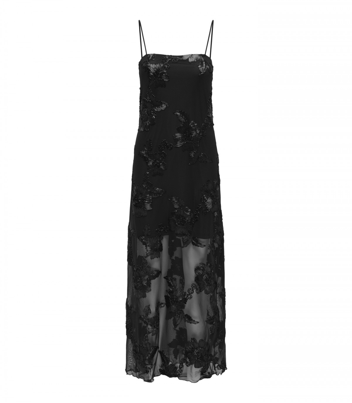 Ši elegantiška ilga suknelė puikiai tinka oficialioms progoms. Lengvas tinklinis audinys su siuvinėtais gėlių raštais sukuria permatomą, moterišką efektą. Plonos petnešėlės ir tiesaus kirpimo suknelė paryškina figūrą ir užtikrina patogų kirpimą.