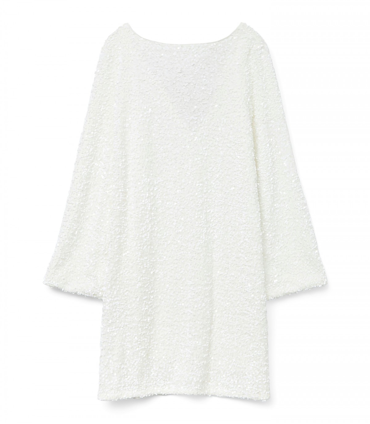 Ši trumpa balta suknelė, siuvinėta žvilgančiais blizgučiais, puošta plačiu juodu raišteliu ties iškirpte. Plačios rankovės ir tiesaus kirpimo dėka ji tinka ir formalesnėms progoms.
