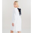 Ši trumpa balta suknelė, siuvinėta žvilgančiais blizgučiais, puošta plačiu juodu raišteliu ties iškirpte. Plačios rankovės ir tiesaus kirpimo dėka ji tinka ir formalesnėms progoms.