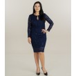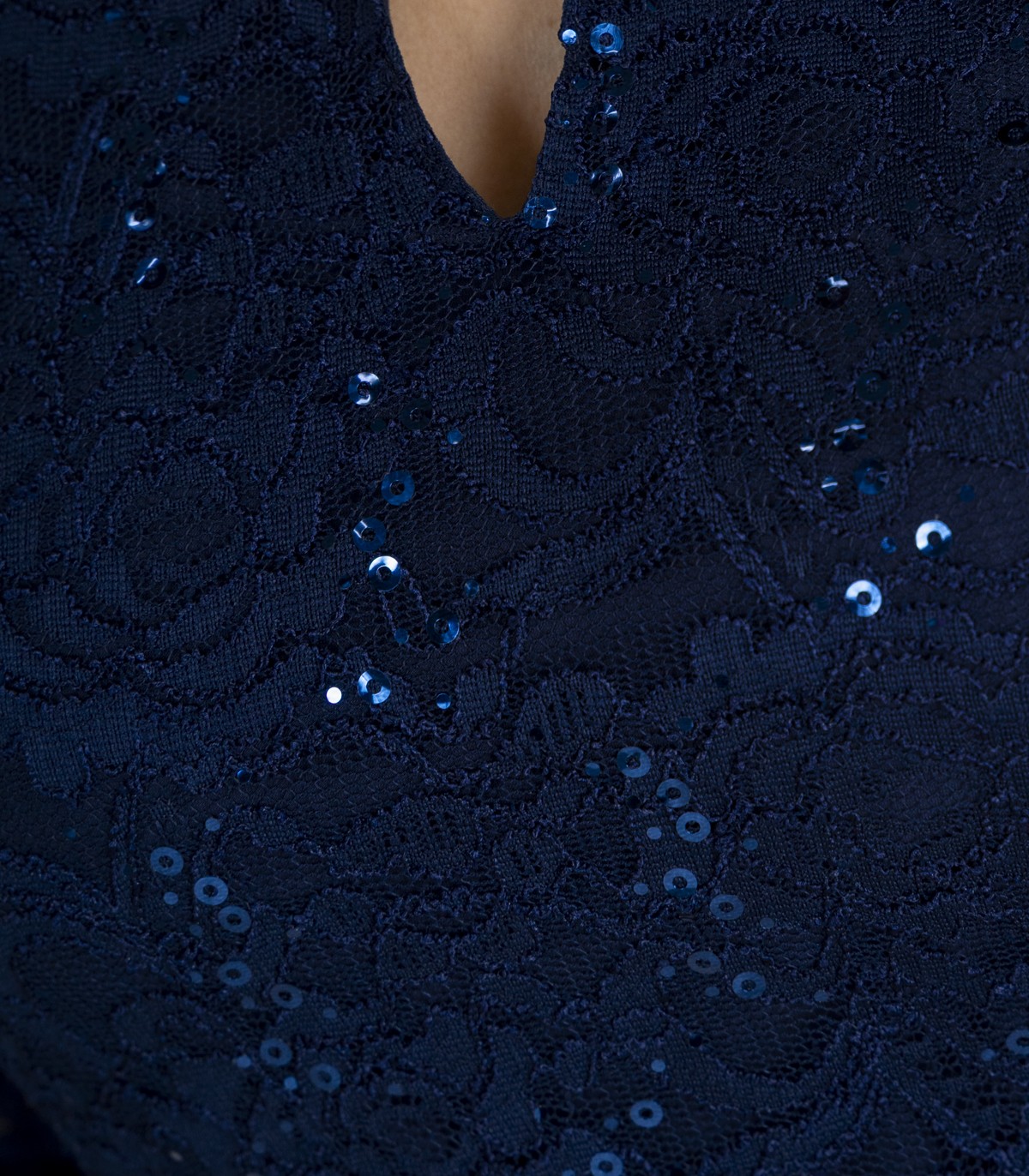 Ši tamsiai mėlyna nėriniuota suknelė pasižymi žvilgančiais, elegantiškais blizgučiais. Ji turi apvalią iškirptę ir nedidelį skeltuką priekyje. Ilgos nėriniuotos rankovės ir aptemptas kirpimas sukuria elegantišką siluetą.