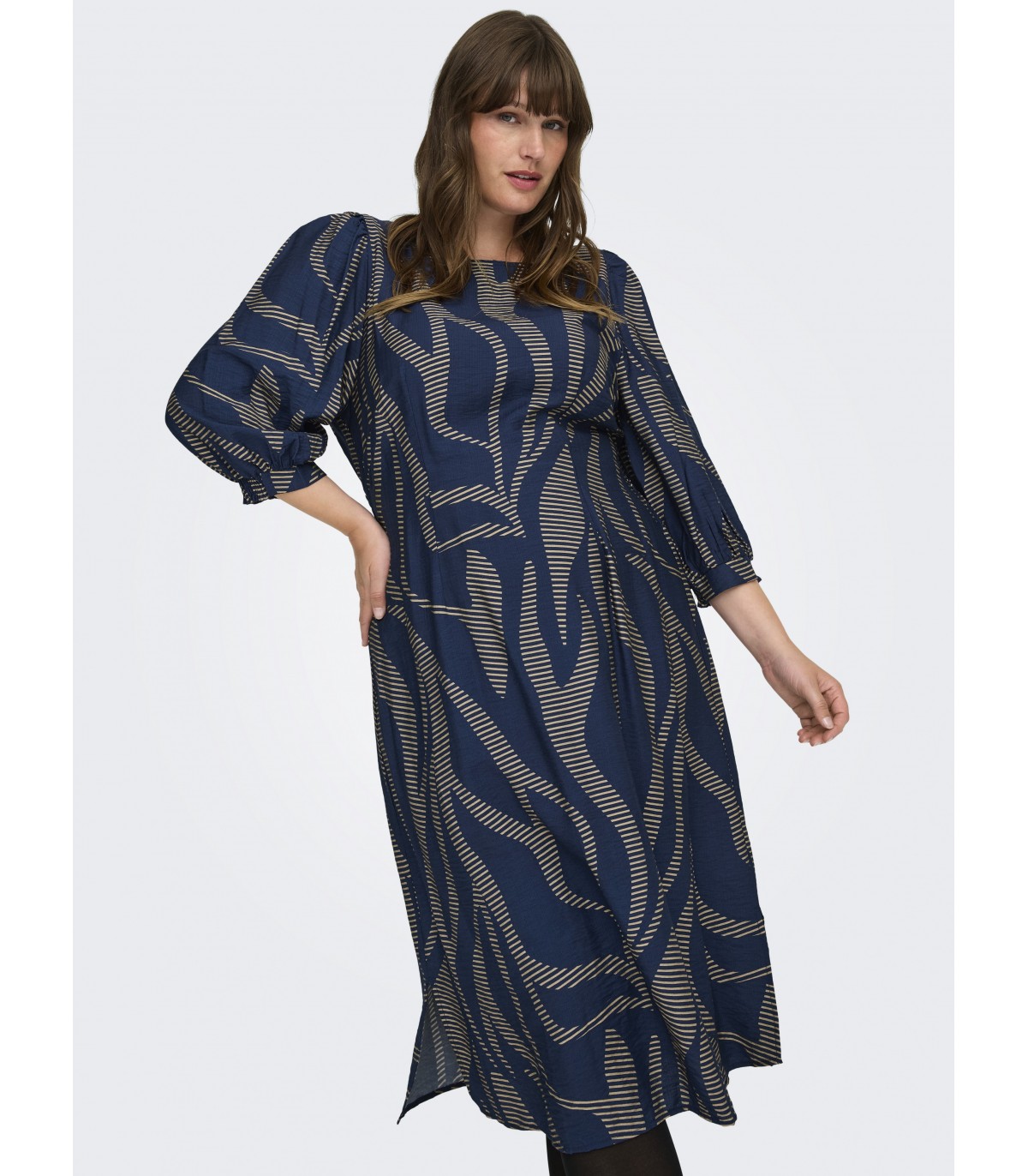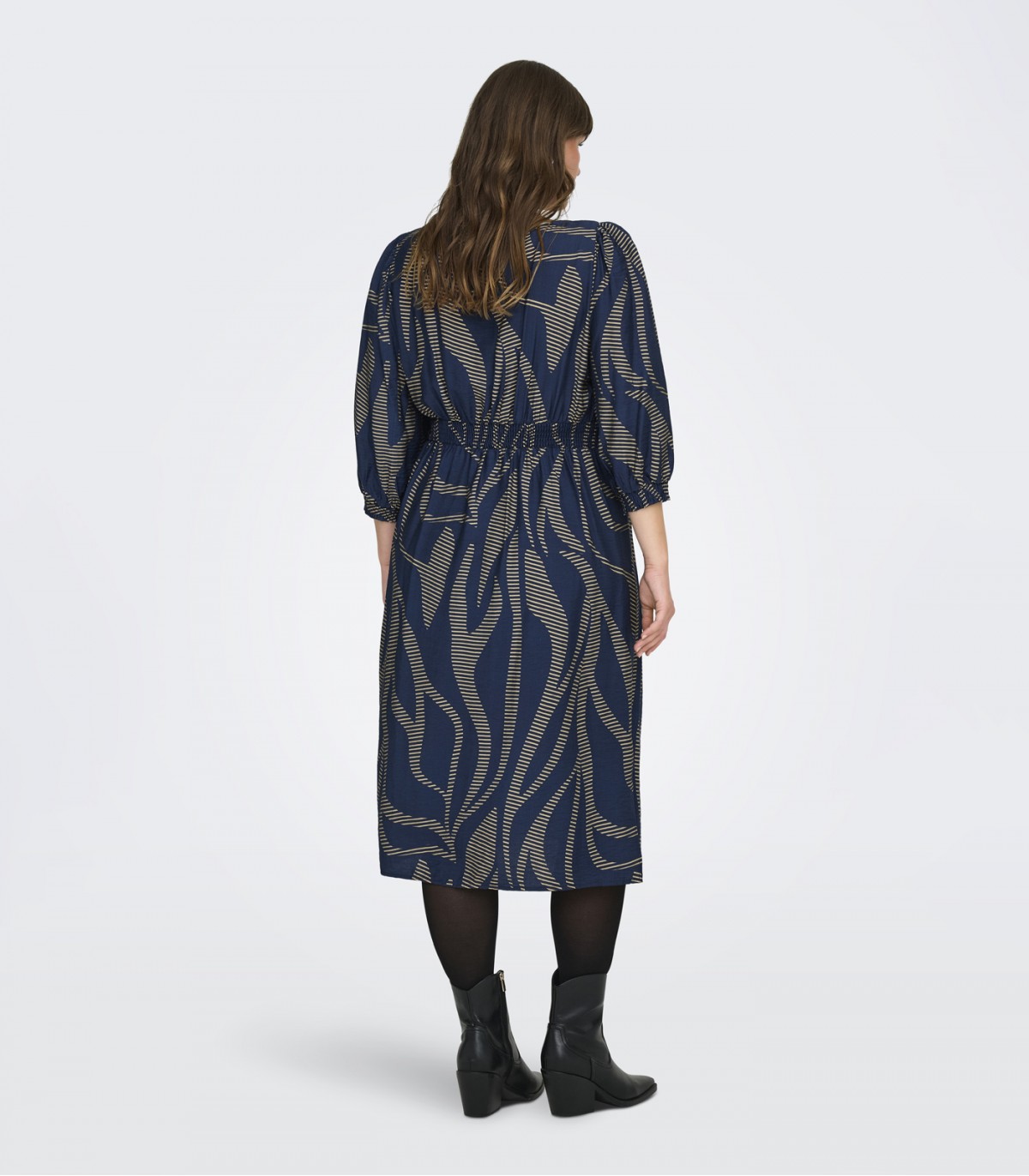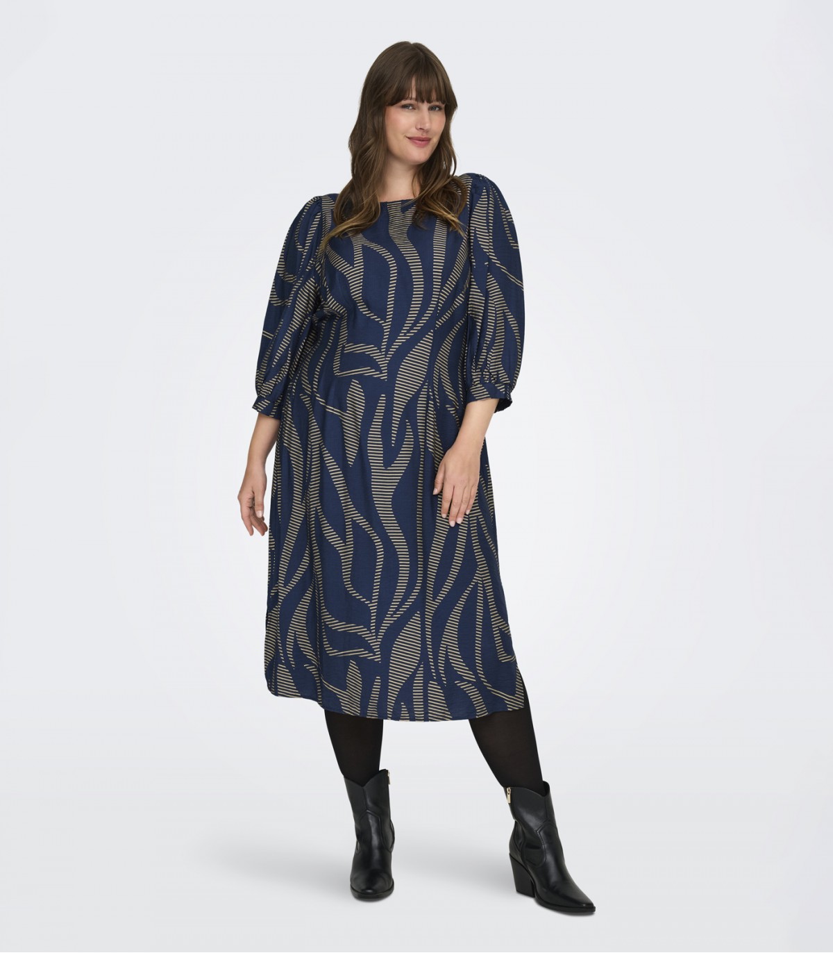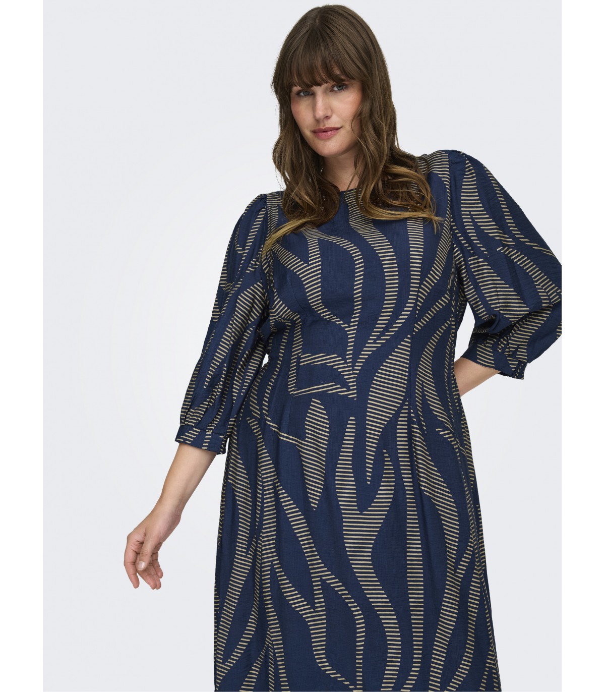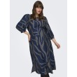 Ši stilinga midi ilgio suknelė su ryškiu abstrakčiu raštu sukuria elegantišką ir modernų įvaizdį. Laisvas kirpimas su plačiomis 3/4 rankovėmis ir apvalia iškirpte užtikrina patogumą ir judesių laisvę.