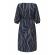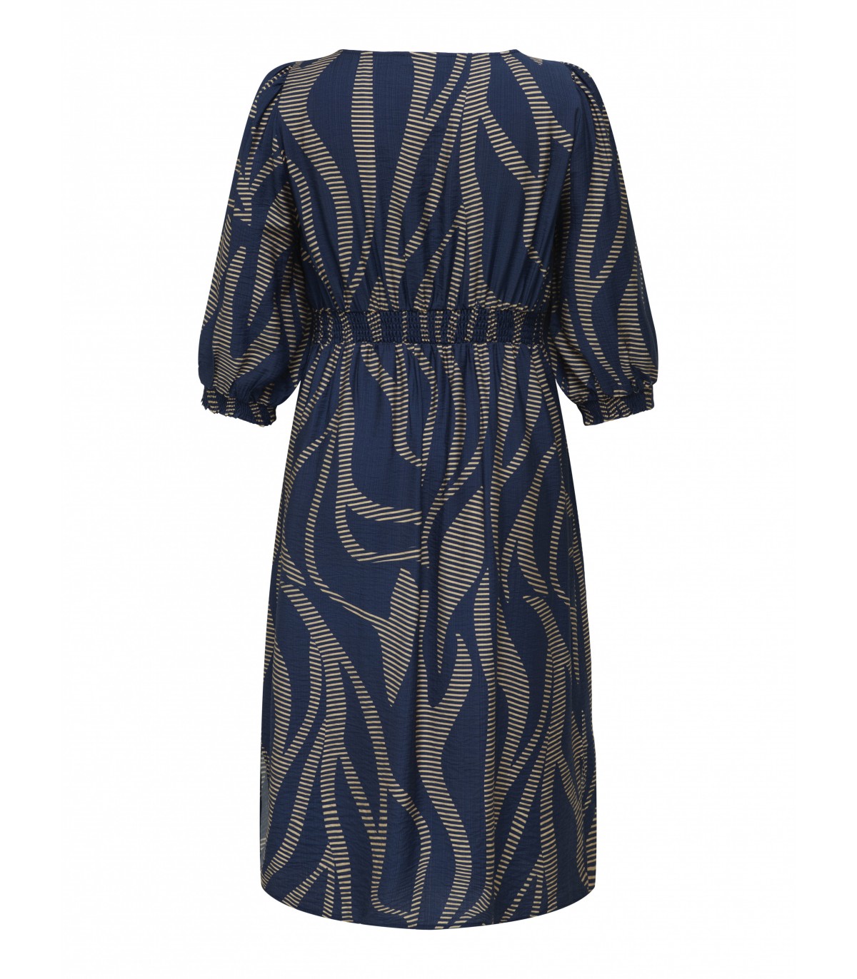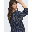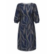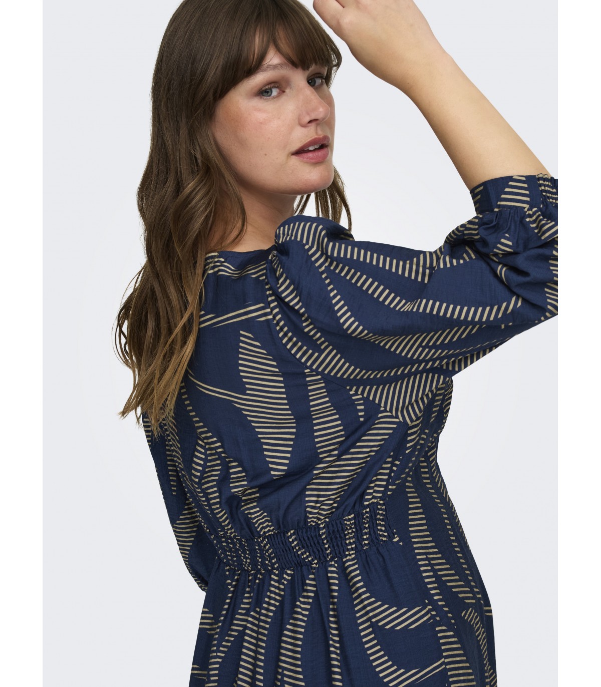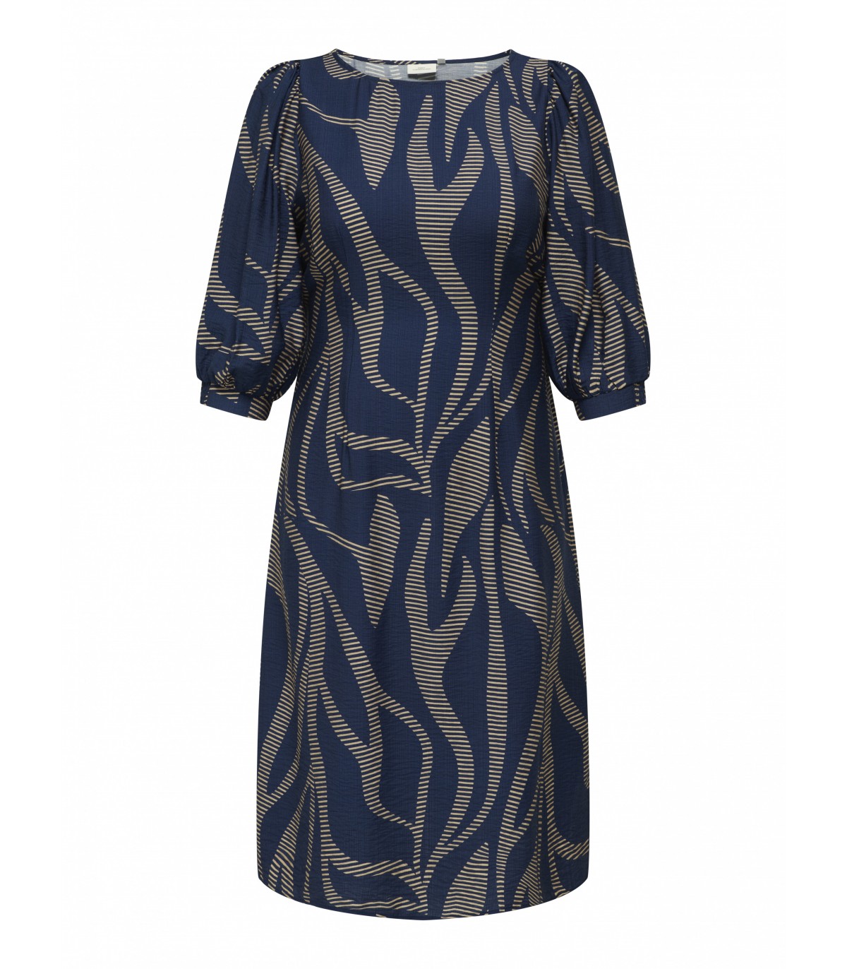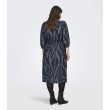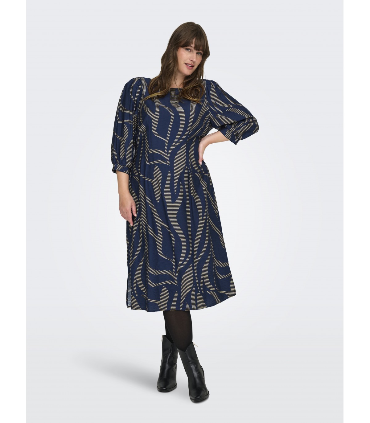 Ši stilinga midi ilgio suknelė su ryškiu abstrakčiu raštu sukuria elegantišką ir modernų įvaizdį. Laisvas kirpimas su plačiomis 3/4 rankovėmis ir apvalia iškirpte užtikrina patogumą ir judesių laisvę.