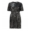 Ši žvilganti suknelė pasižymi trumpomis rankovėmis, išsiuvinėtomis smulkiais blizgučiais. Ji turi apvalią iškirptę ir tamprią juosmens juostą, pabrėžiančią moterišką siluetą. Puikiai tinka oficialioms progoms ir vakariniams renginiams.