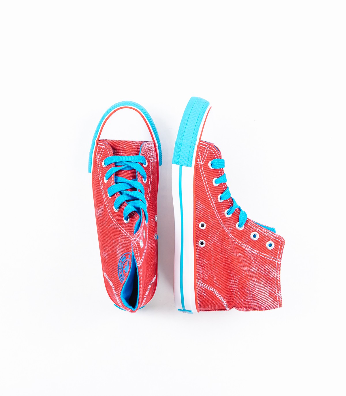 Įspūdingi vaikiški sportbačiai iš raudonos tekstilės su mėlynais raišteliais.