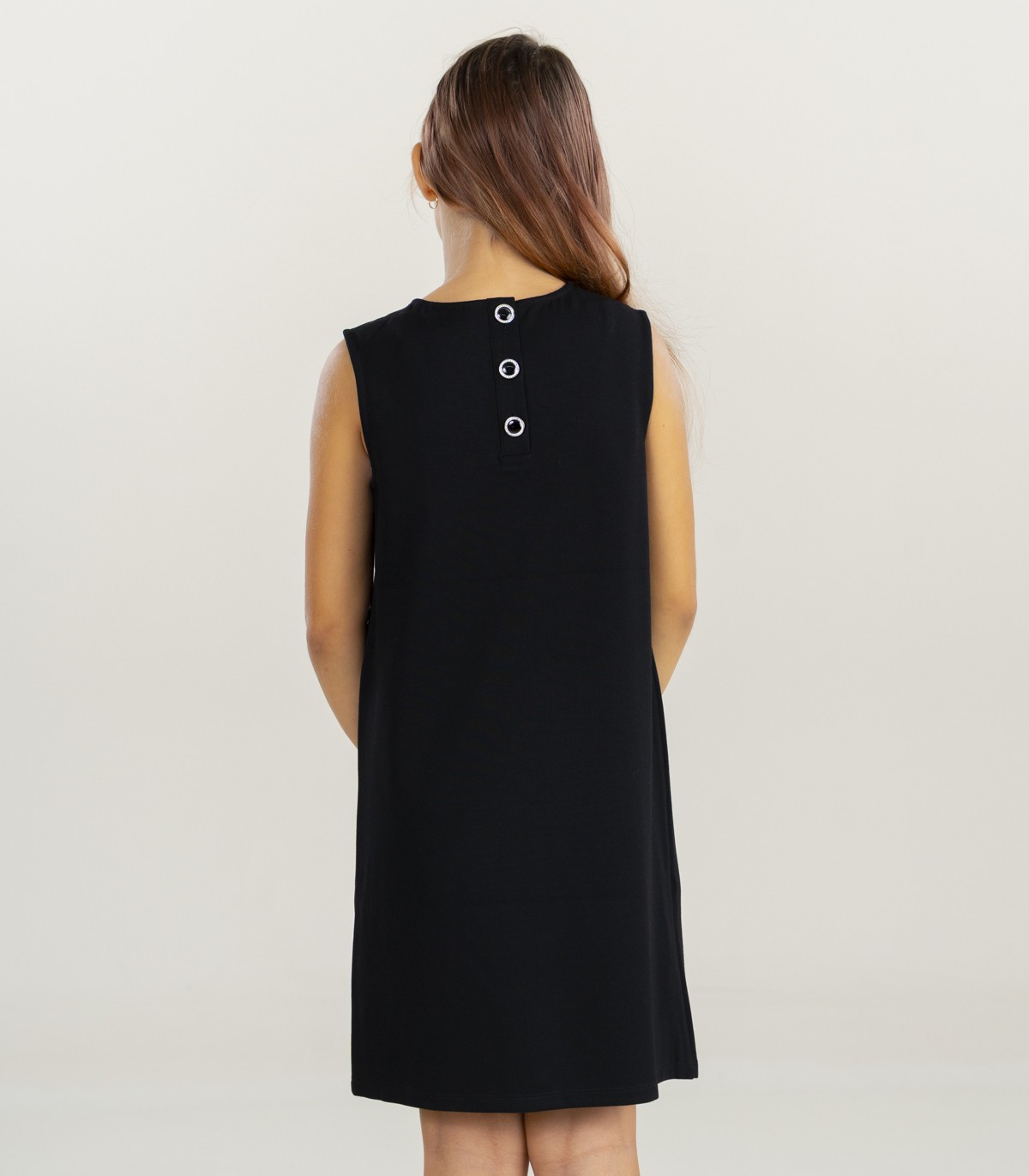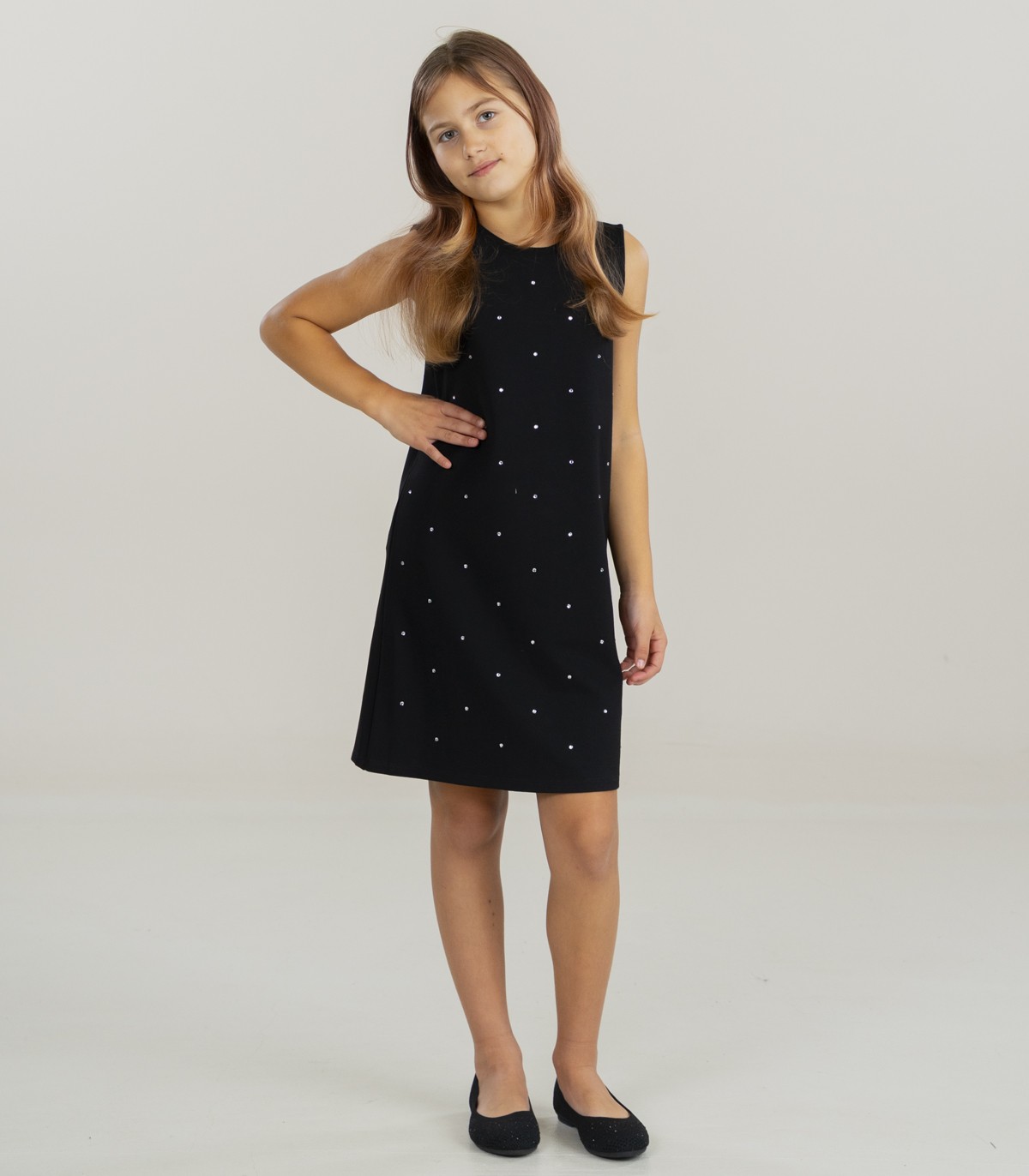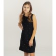 Ši „Guess“ suknelė mergaitėms pasižymi paprastu, tačiau elegantišku dizainu, puikiai tinkančiu oficialioms progoms. Juoda suknelė papuošta mažais žėrinčiais akmenėliais, suteikiančiais subtilaus blizgesio. Tiesaus kirpimo ir berankovis modelis užtikrina patogumą, o dekoratyvinės sagos nugaroje suteikia žavesio.