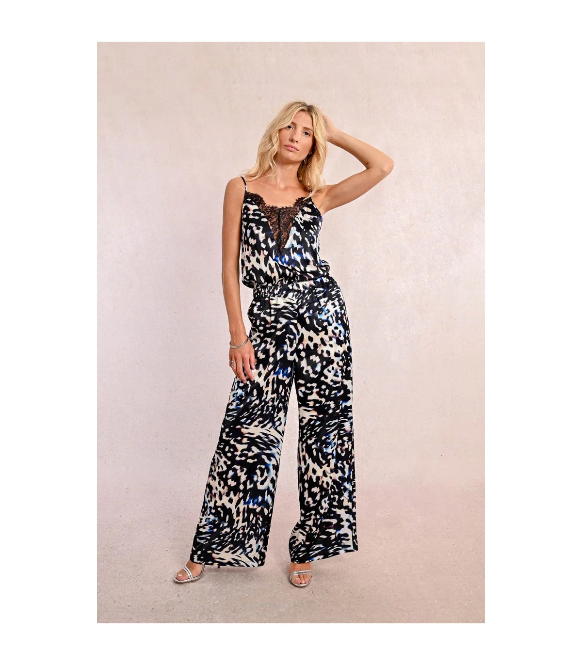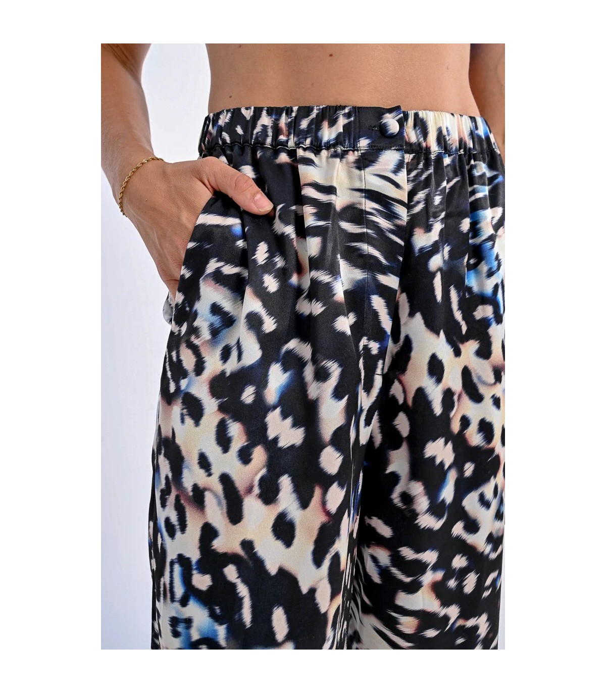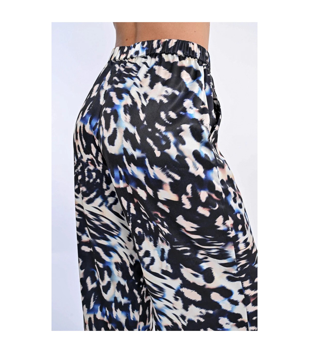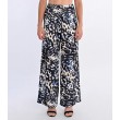 Moteriškos kelnės pagamintos laisvo tiesaus kirpimo, suteikiančios komfortą ir elegantišką siluetą. Lengvas, tekantis audinys suteikia išvaizdai moteriškumo, o originalus spaudinys suteikia žavesio. Modelis puikiai tinka tiek kasdieniam, tiek vakariniam dėvėjimui. Kelnės gali būti derinamos su pagrindiniais viršutiniais drabužiais, palaidinėmis ar švarkais.