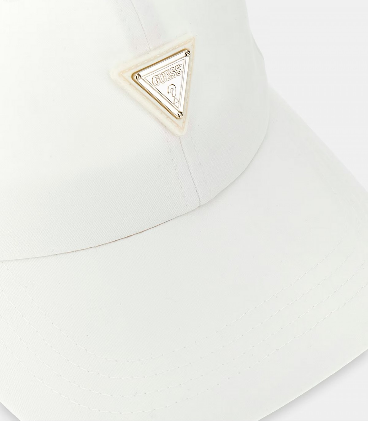 Sportinio ir minimalistinio stiliaus moteriška „Guess“ kepurė su trikampio formos logotipu priekyje.