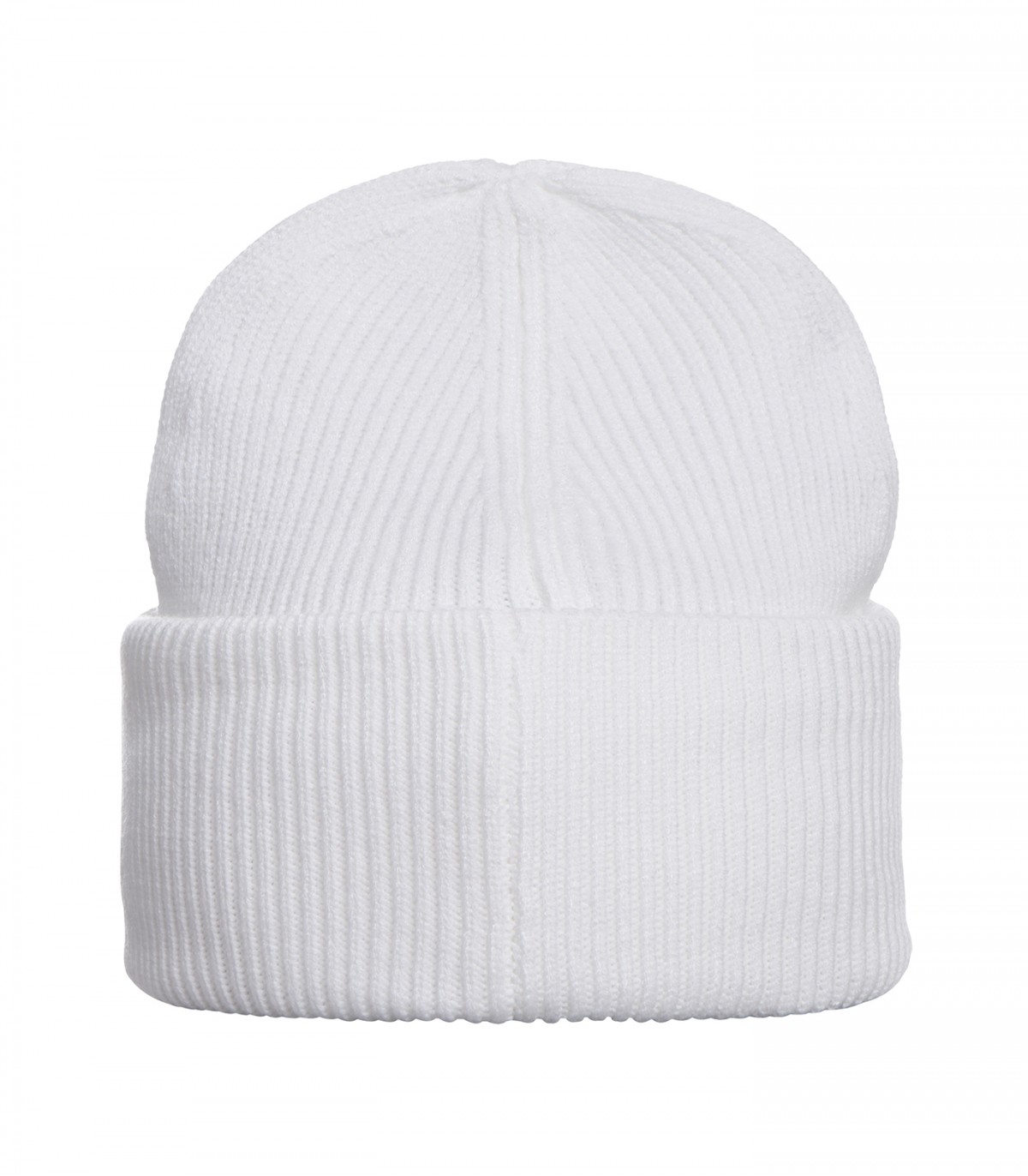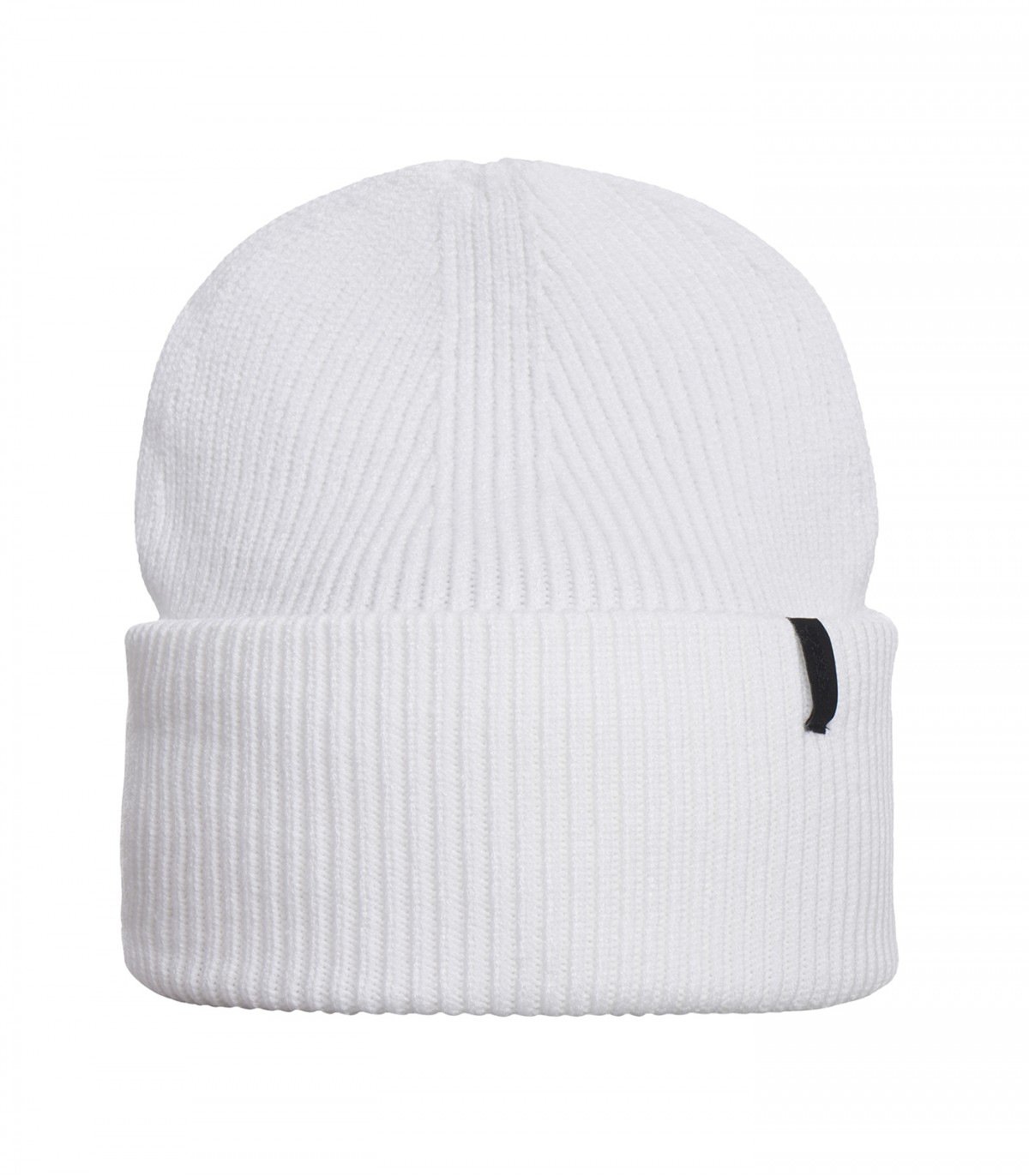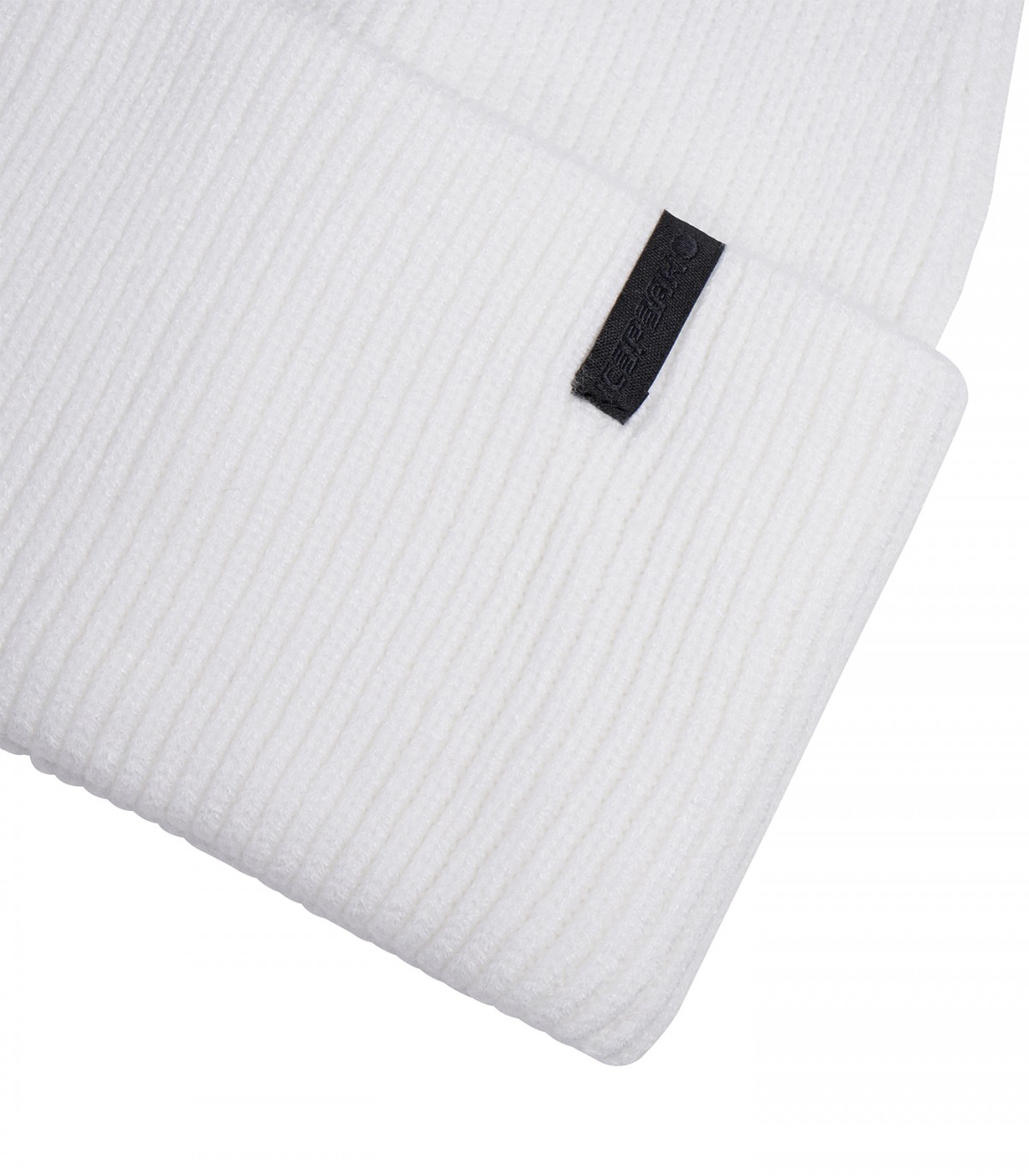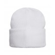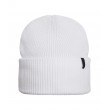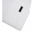 Balta moteriška briaunota kepurė su užlenktu snapeliu ir mažu juodu logotipu. Minkšta, tampri medžiaga patogiai priglunda ir šildo galvą šaltomis dienomis.