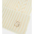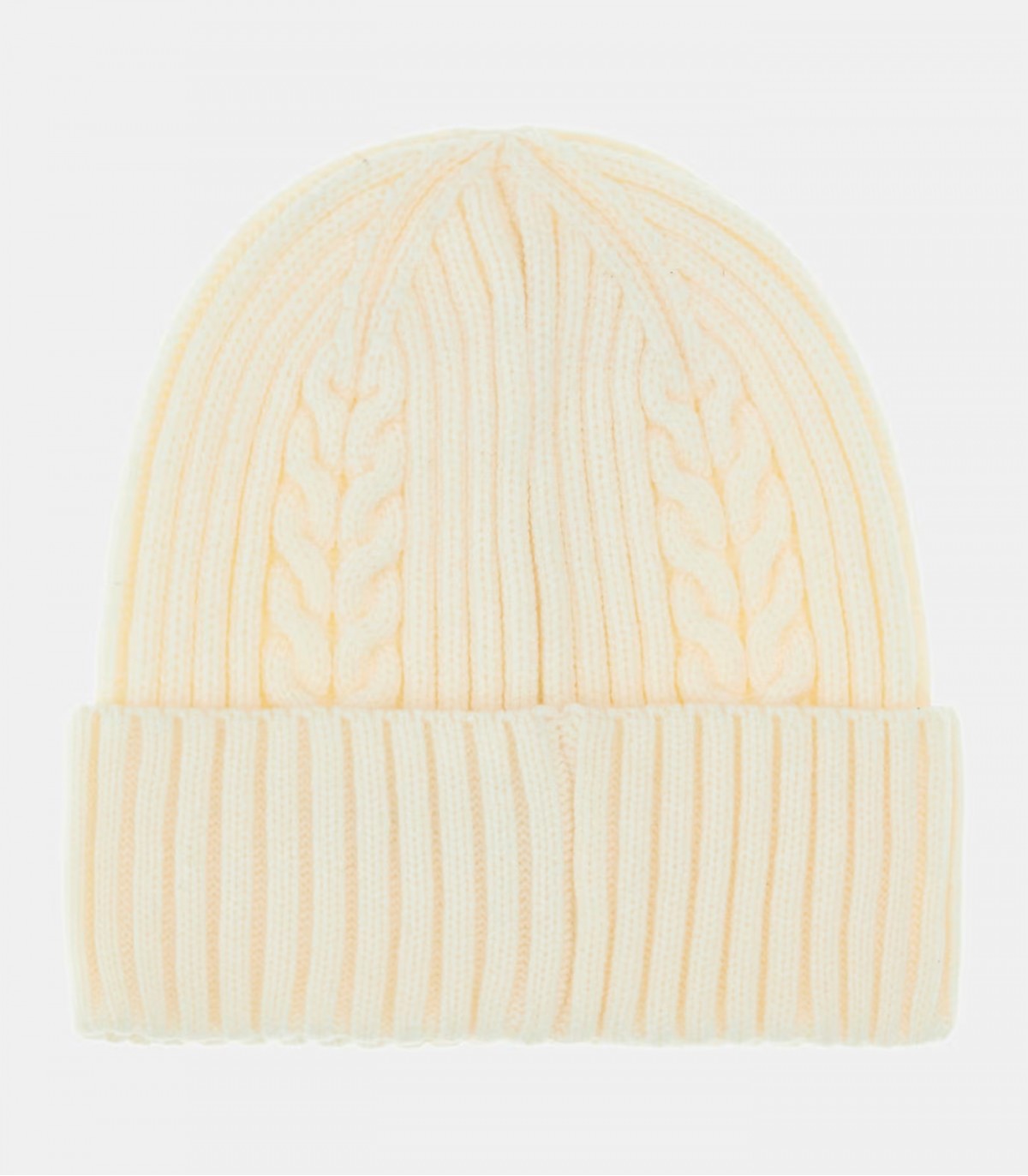 Stilinga briaunota megzta kepurė su dekoratyvinėmis pynelėmis ir metaliniu logotipu. Ji suteikia šilumos ir komforto, suteikdama jaukumo ir mados bet kokiam įvaizdžiui.