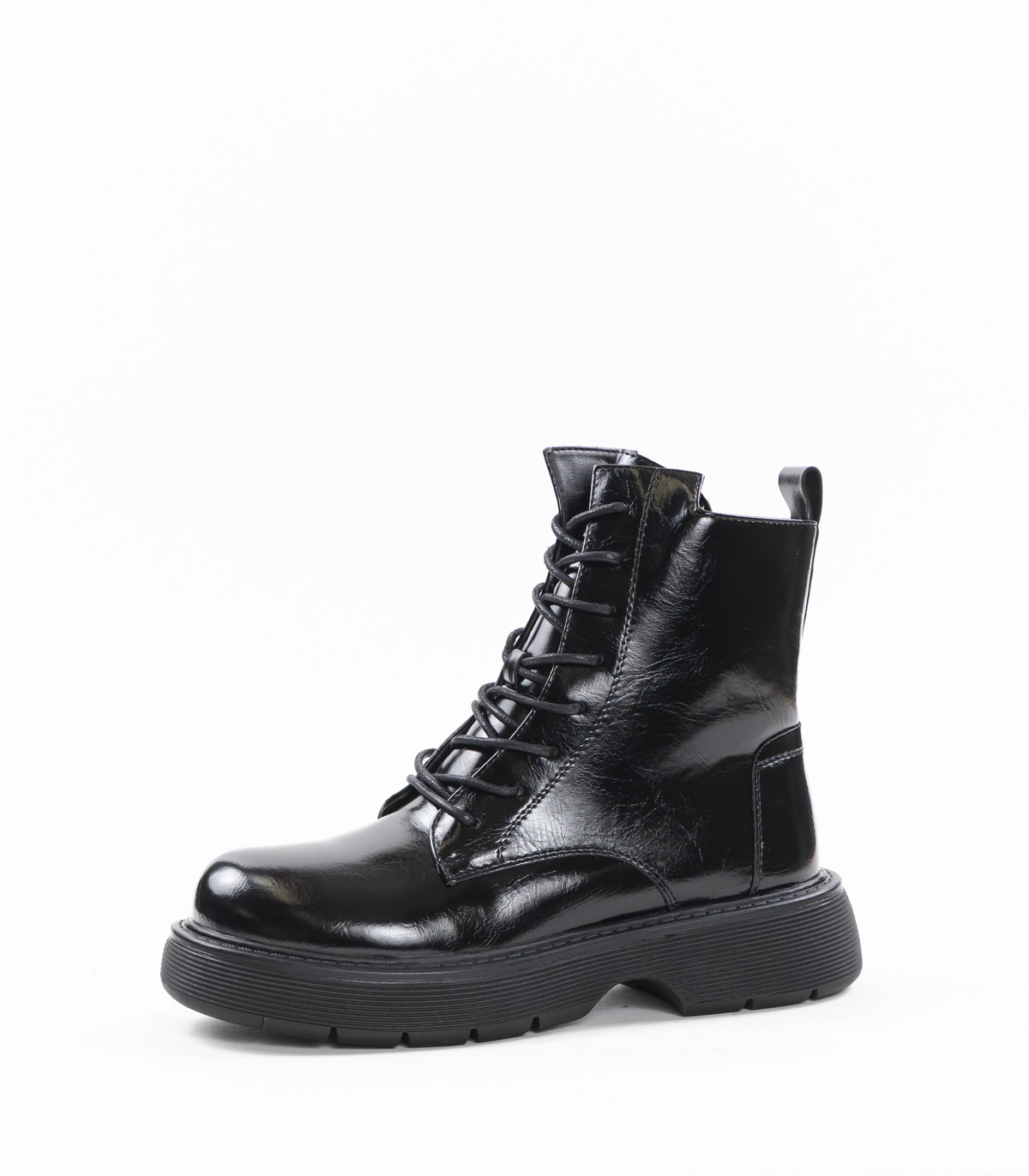 Modernūs ir praktiški moteriški aulinukai iki kulkšnių, pagaminti iš blizgios juodos dirbtinės odos. Storas padas užtikrina komfortą ir stabilumą kiekviename žingsnyje.