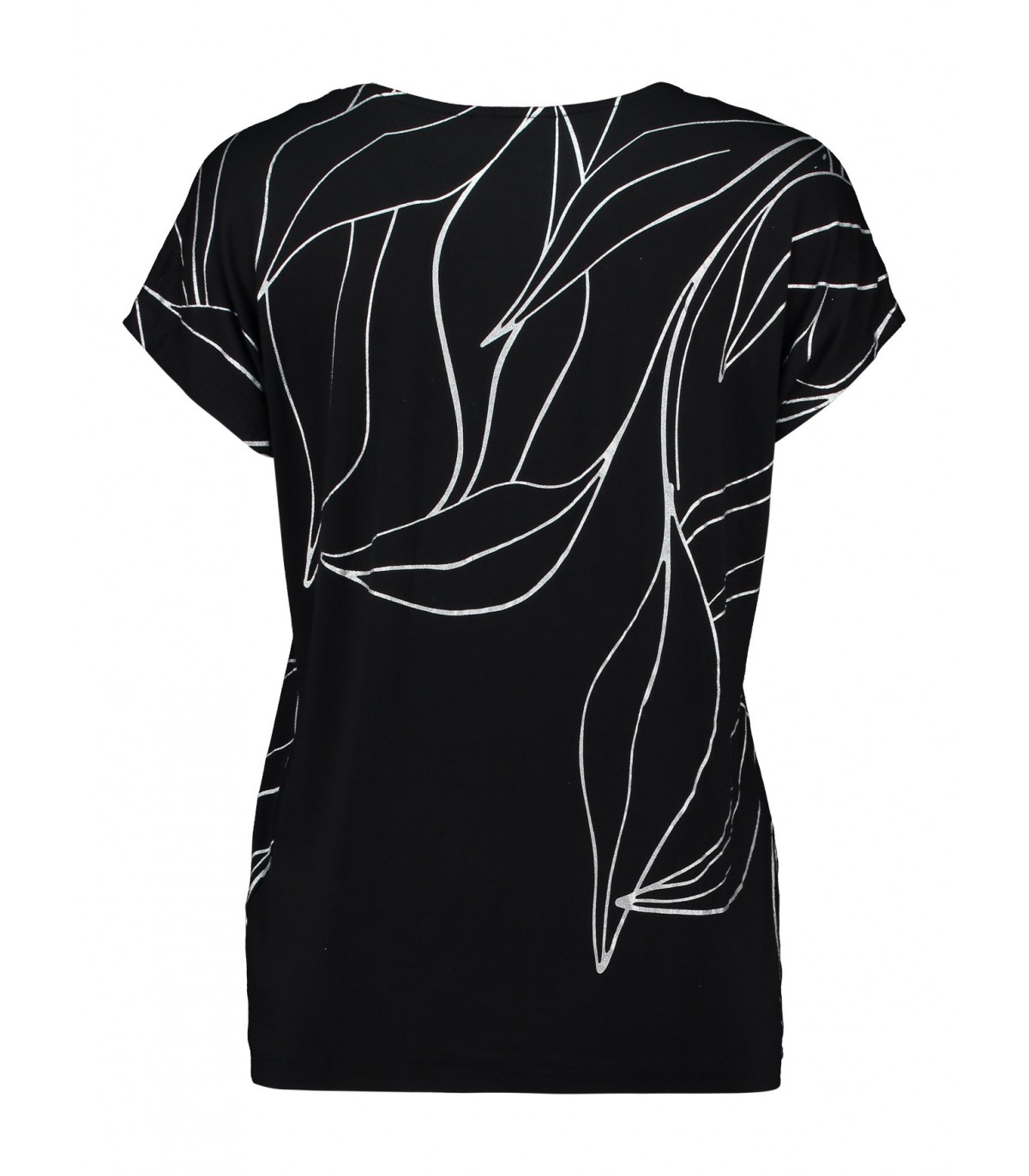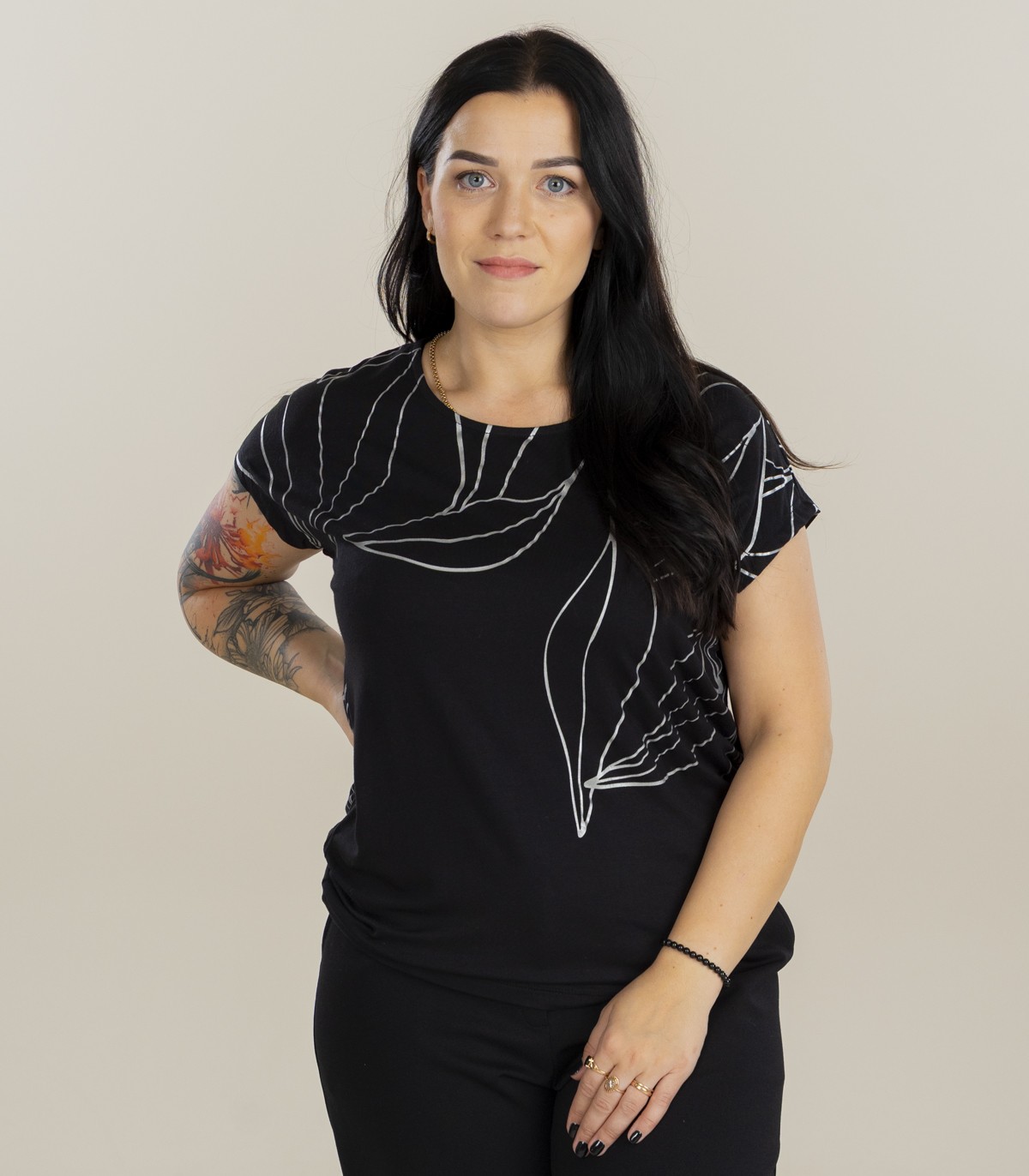 Must T-särk valge graafilise lehemustriga. Mugava lõike ja lühikeste varrukatega mudel sobib igapäevaseks kandmiseks.