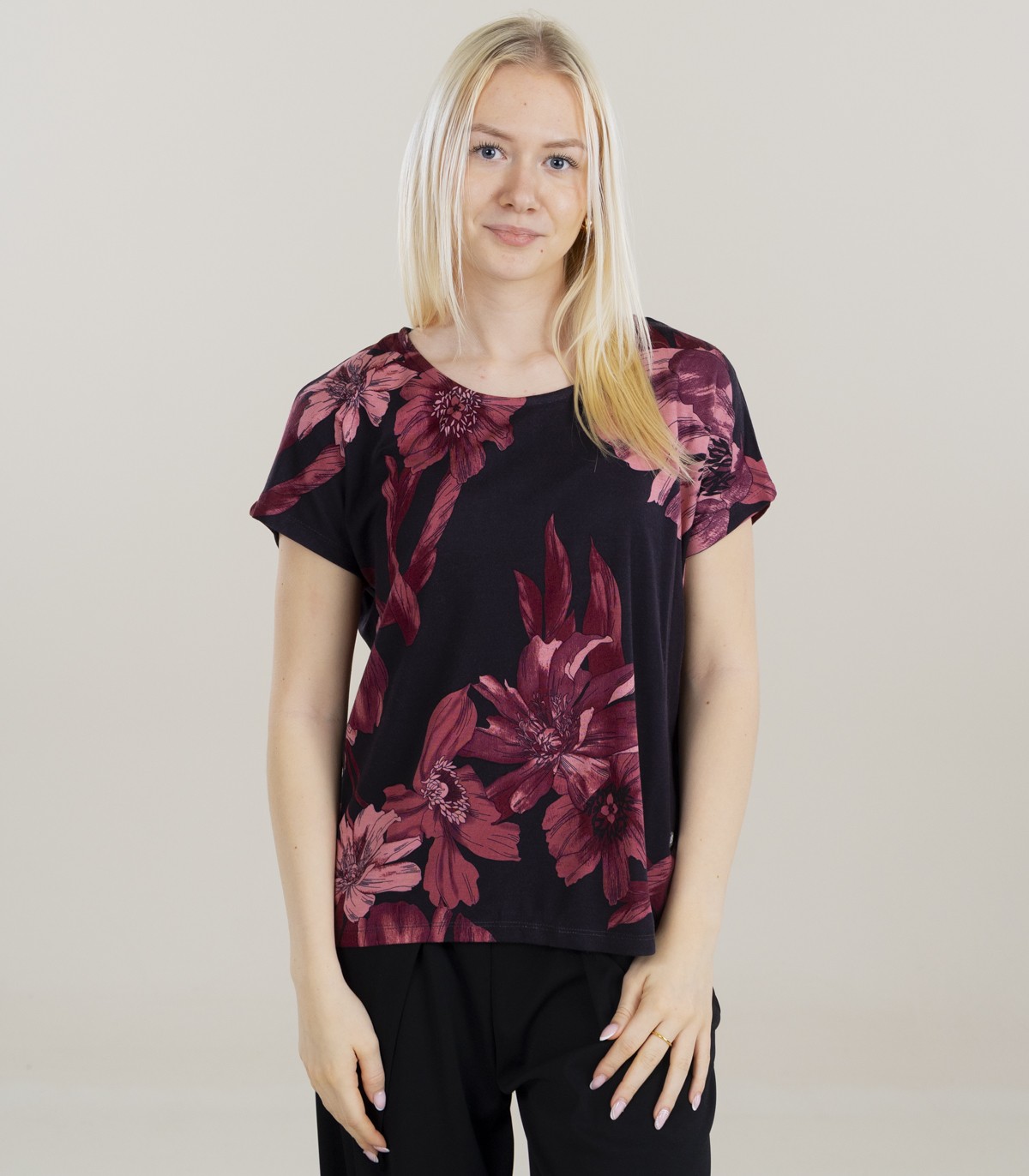 Lühikeste varrukatega T-särk suure ja efektse lillemustriga. Mugav ja kergesti sobitatav igapäevaseks kandmiseks, sobib nii teksade kui ka seelikuga.
