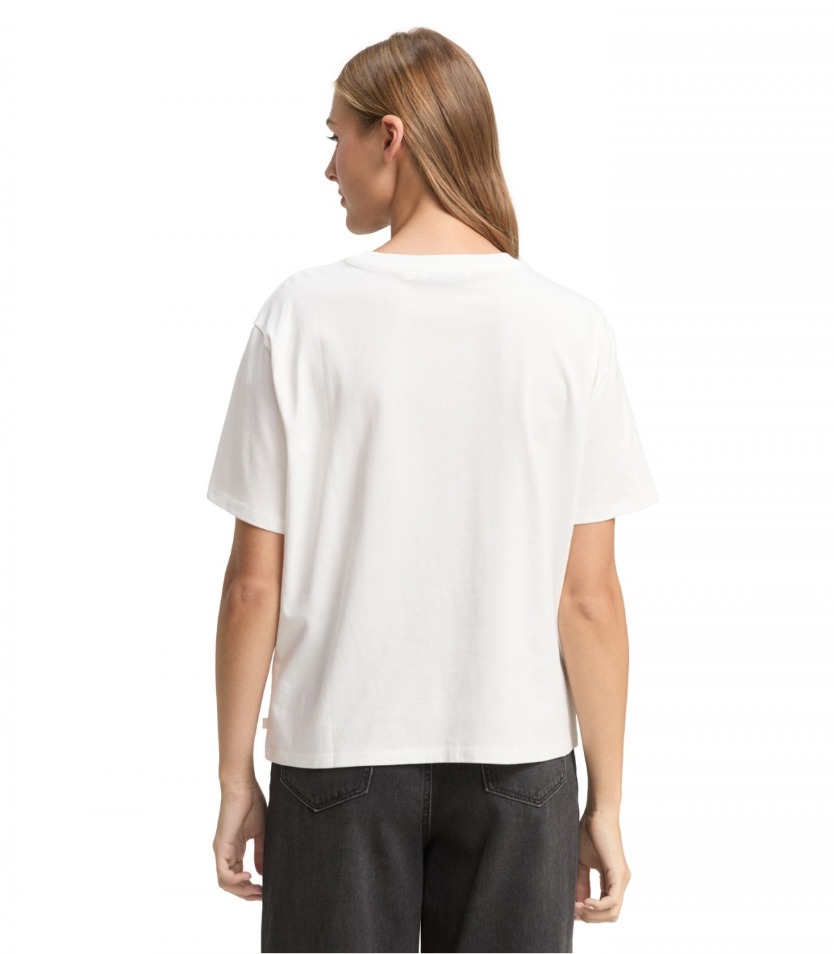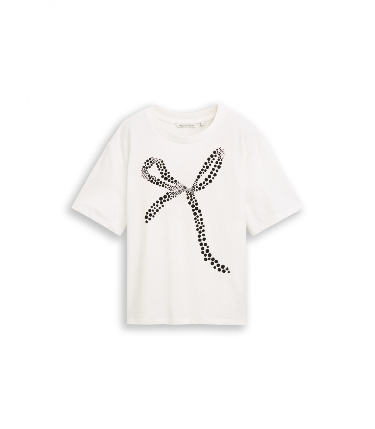 Tom Tailor naiste T-särk on lihtne ja mugav valik igasse päeva. Valge puuvillane trikotaaž on pehme ja hingav. Ees on mustadest täppidest moodustatud graafika, mis annab särgile efektse aktsendi ja sobib hästi kandmiseks nii teksadega kui pintsaku alla.