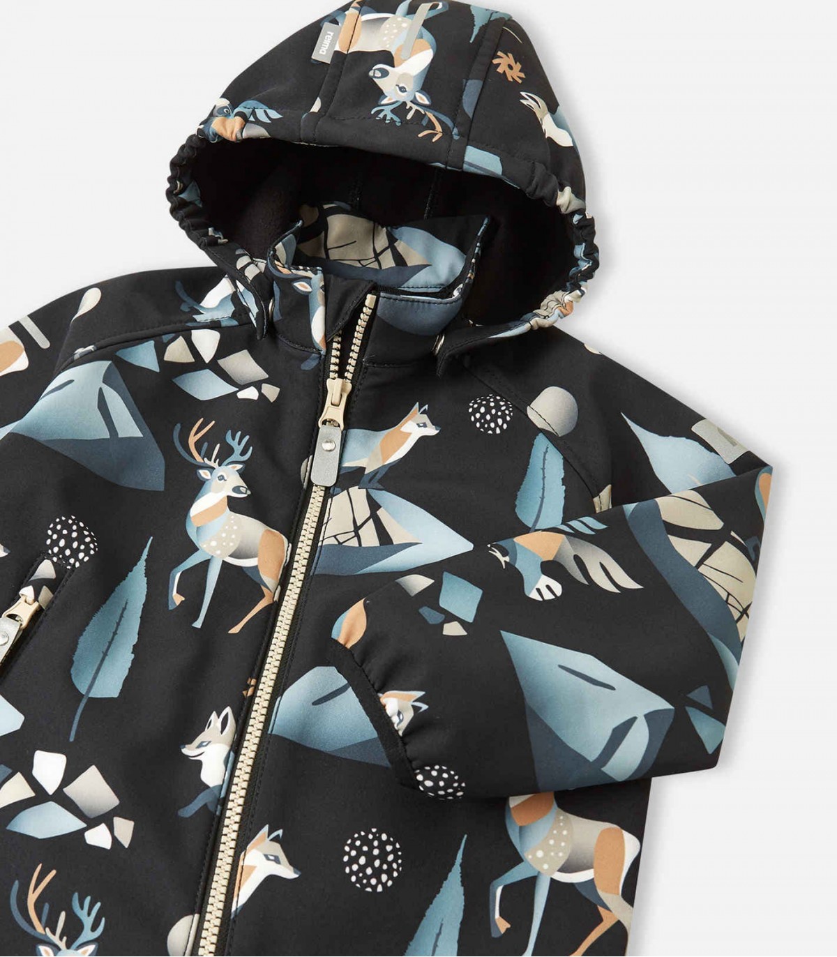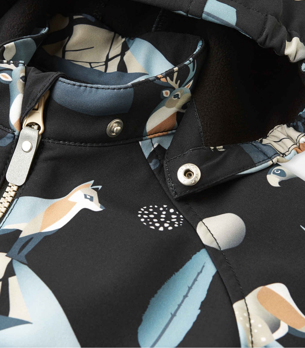 Tuulekindel, hingav ja vastupidav väikelaste softshell-kombe Mjosa on mugav iga ilmaga. Kombe ülemine osa on kaetud metsloomade ja looduse mustriga, alumine osa on tugevdatud kulumiskindla kangaga.