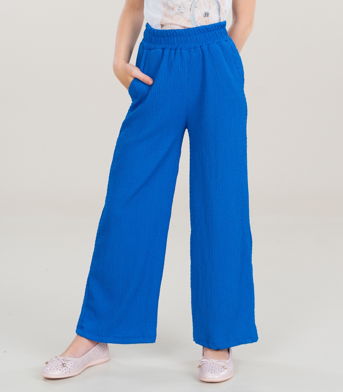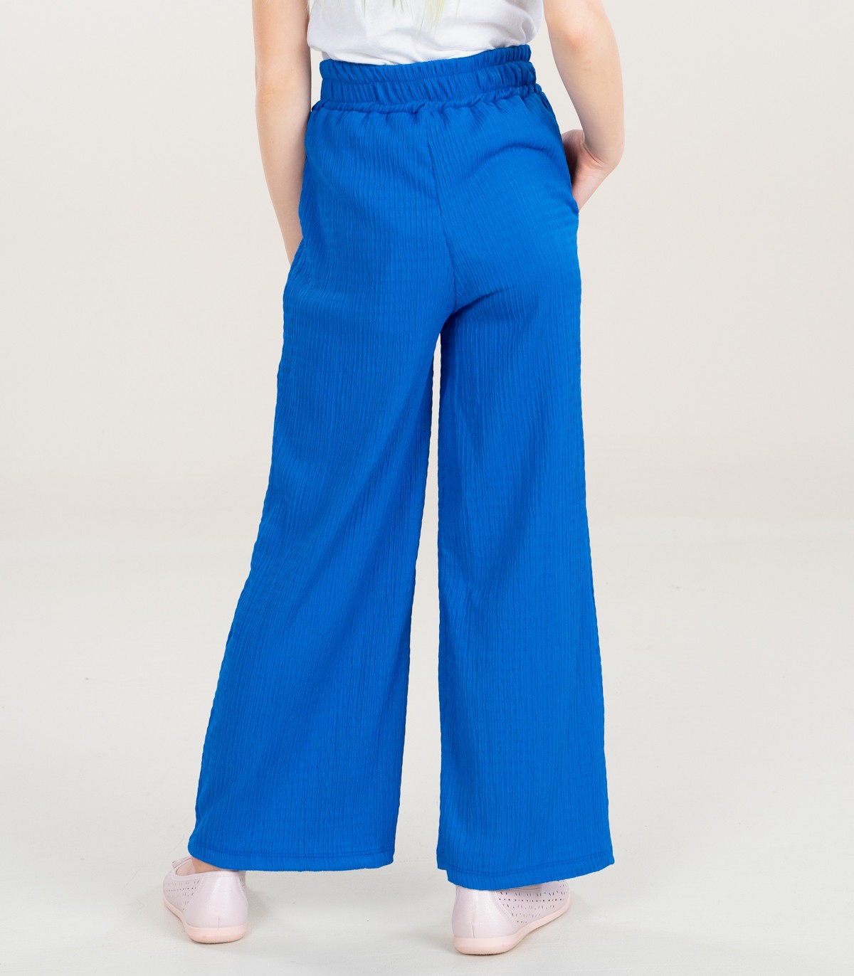 Mugavad ja stiilsed tüdrukute püksid igapäevaseks kandmiseks. Pehmest tekstuurse viimistlusega kangast valmistatud püksid sobivad nii vabaajastiili kui ka veidi pidulikuma riietuse juurde.