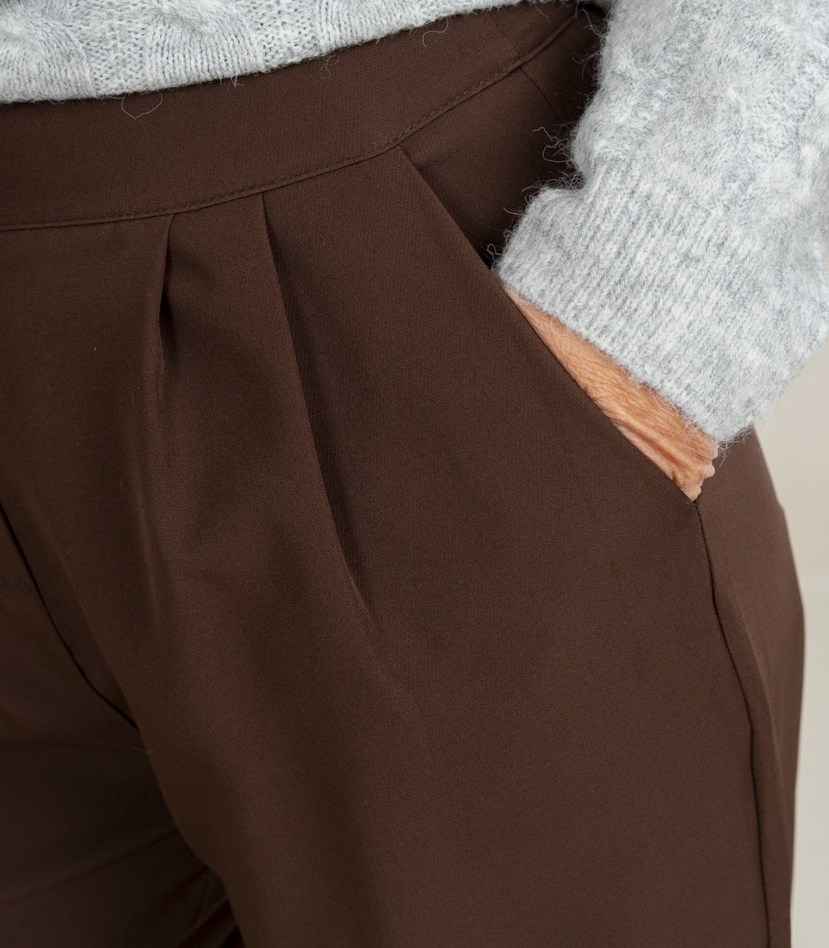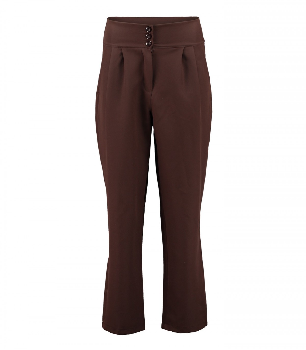 Klassikalised pruunid püksid kõrge piha ja elegantse lõikega. Eesosas on voldid ja kolm nööpi. Sirge säärelõige on mugav ja mitmekülgne.