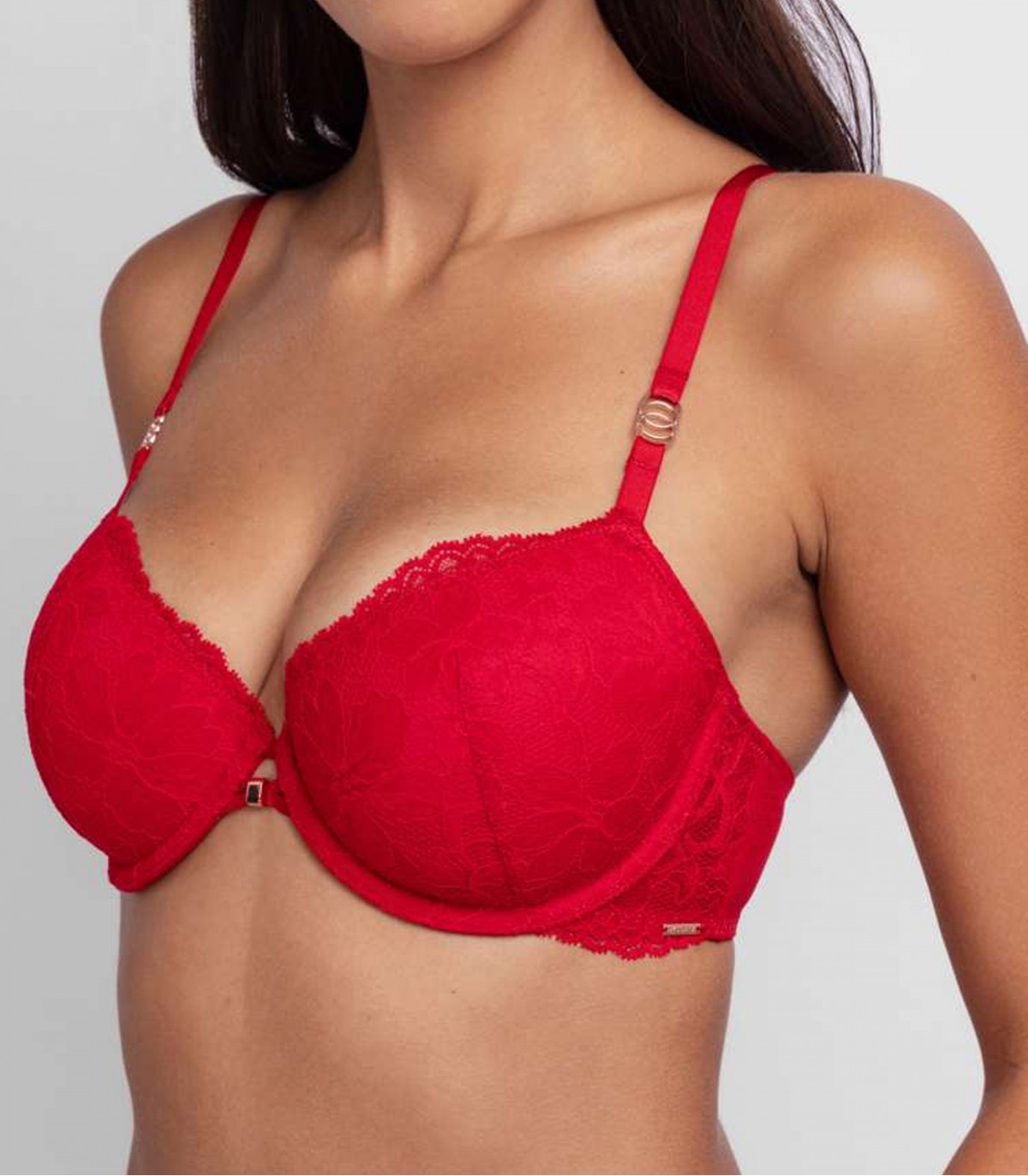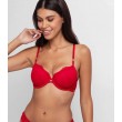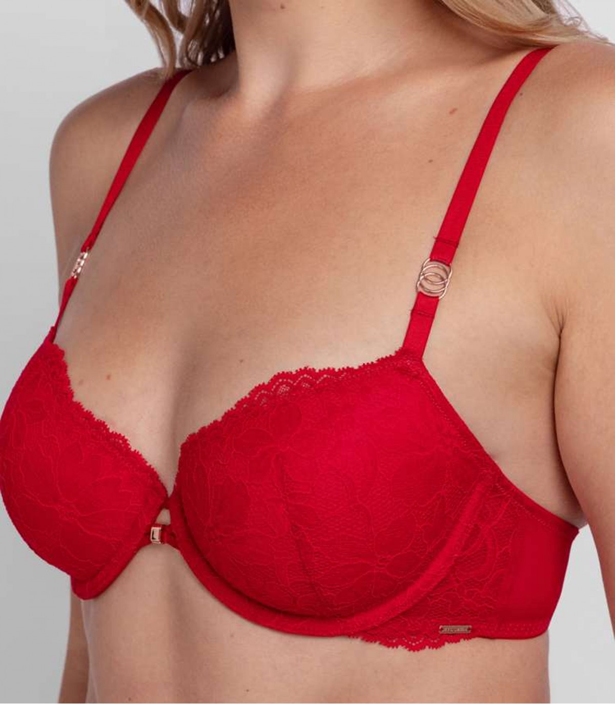Mugav ja elegantne punane pitsiline rinnahoidja. Kergelt polsterdatud vormitud korvid ja toestavad traadid toestavad hästi ning loovad loomuliku kuju. Kaunistuseks on peen toon-toonis pits ja metallist detailid.