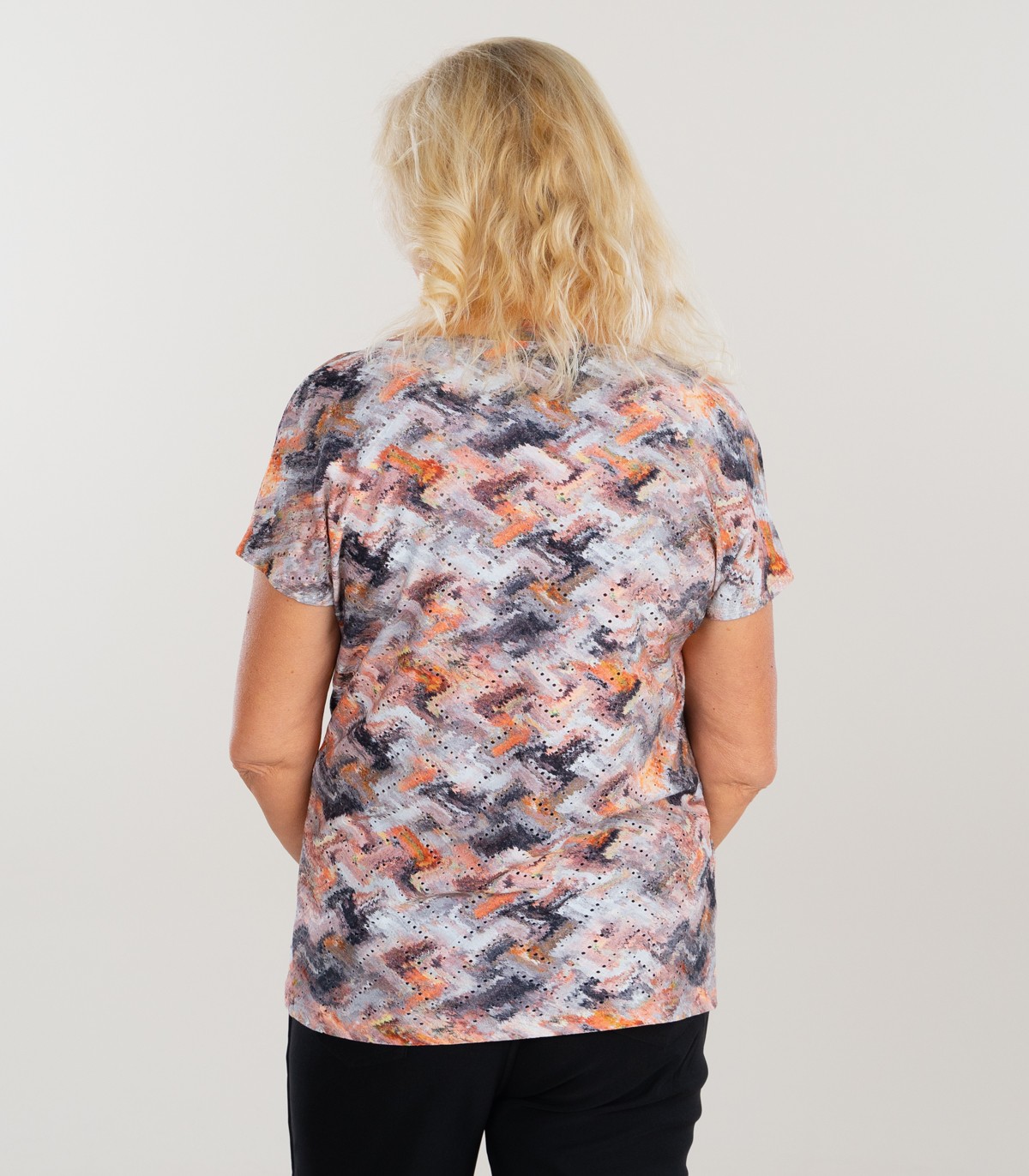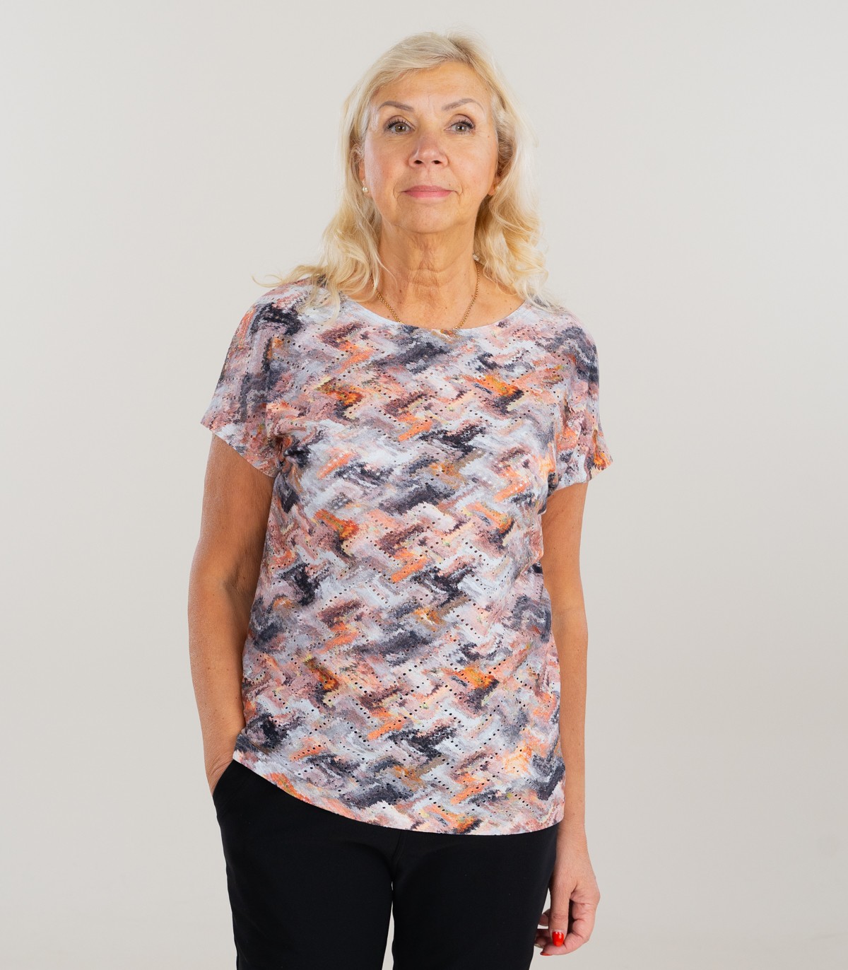 Лёгкая и дышащая женская футболка с короткими рукавами. Стильный узор и ажурная текстура придают модели интересную фактуру и лёгкость.