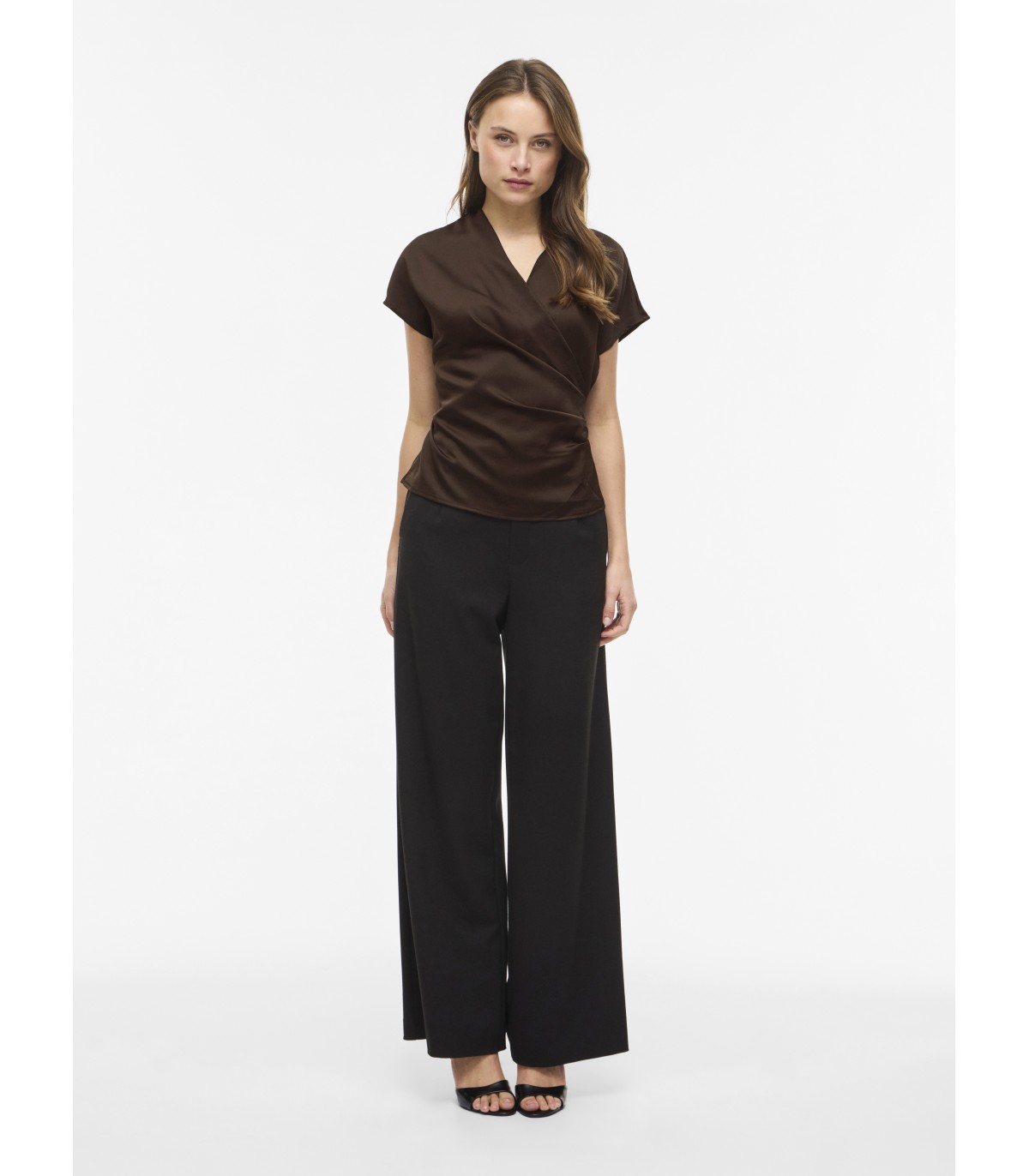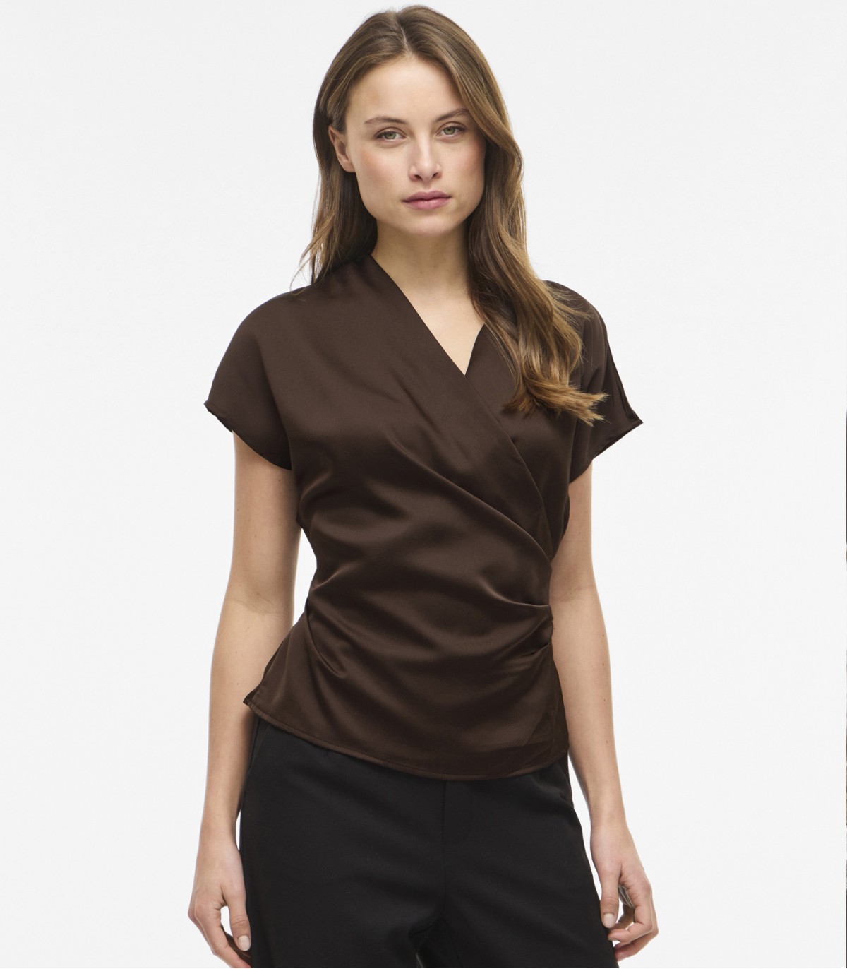 Эта элегантная и слегка блестящая женская блузка подходит как для торжественных мероприятий, так и для повседневной носки. Перекрещивающийся перед и V-образный вырез создают женственный силуэт, который легко сочетается как с брюками, так и с юбками.