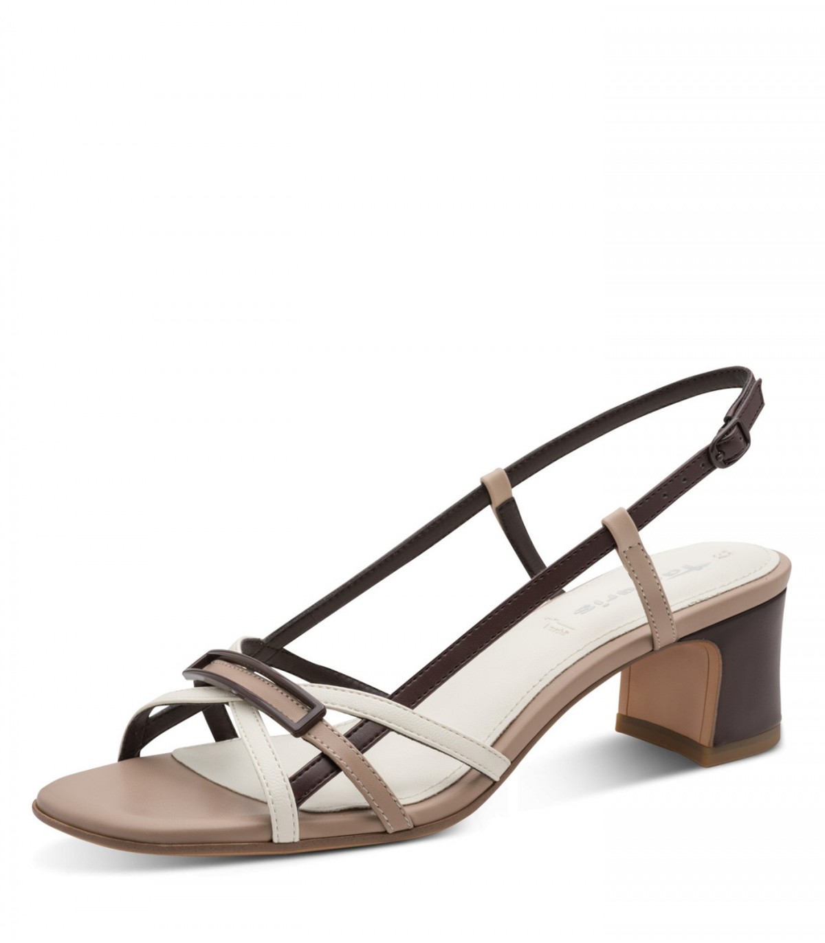 Элегантные трехцветные женские босоножки на устойчивом каблуке с регулируемым ремешком вокруг щиколотки. Подходят для повседневной носки в теплое время года. Мягкая стелька обеспечивает комфорт в течение всего дня.