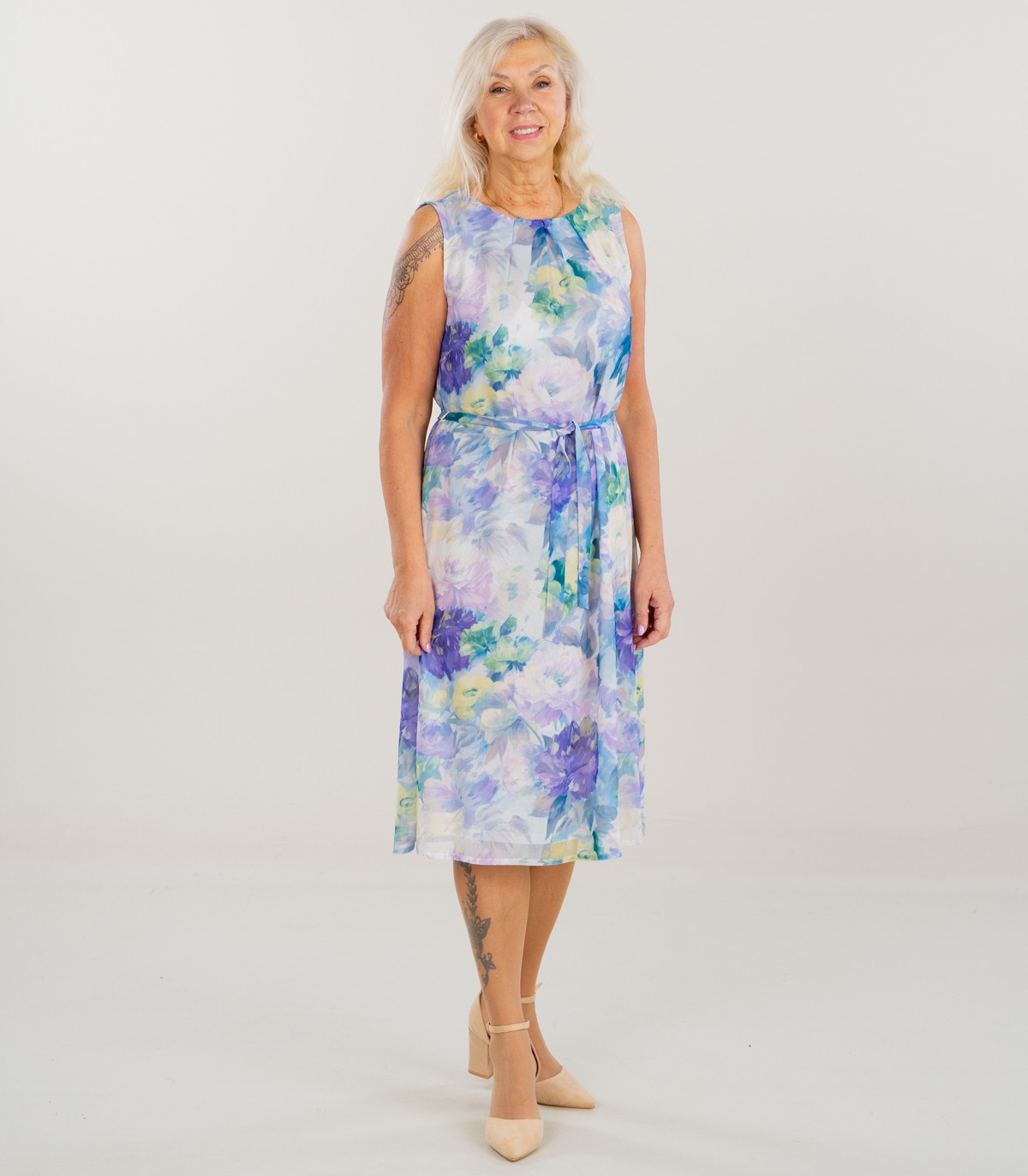 Легкое платье без рукавов из воздушной ткани. Цветочный узор на внешней ткани добавляет романтичности, а гладкая подкладка обеспечивает комфорт. Тонкий тканевый пояс подчеркивает талию.