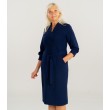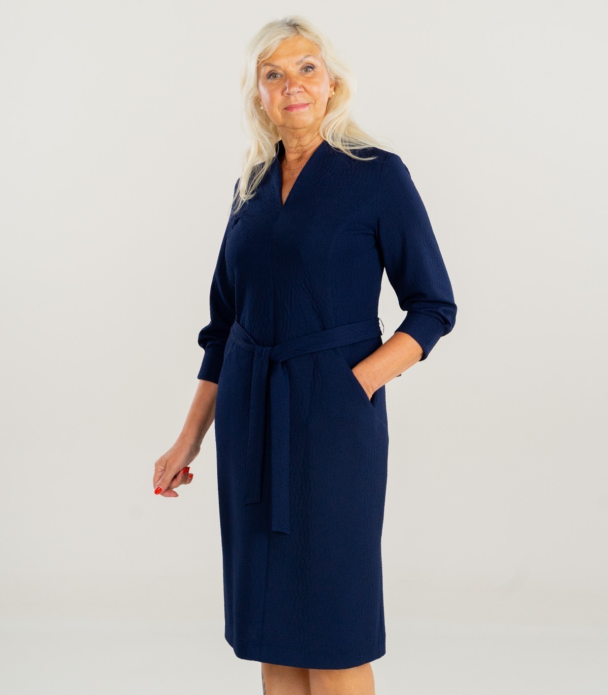 Темно-синее платье — стильный и удобный вариант на каждый день. Структурированная ткань, V-образный вырез и завязка на талии придают платью изысканный вид, подчеркивая фигуру. Подходит для работы, мероприятий и отдыха.
