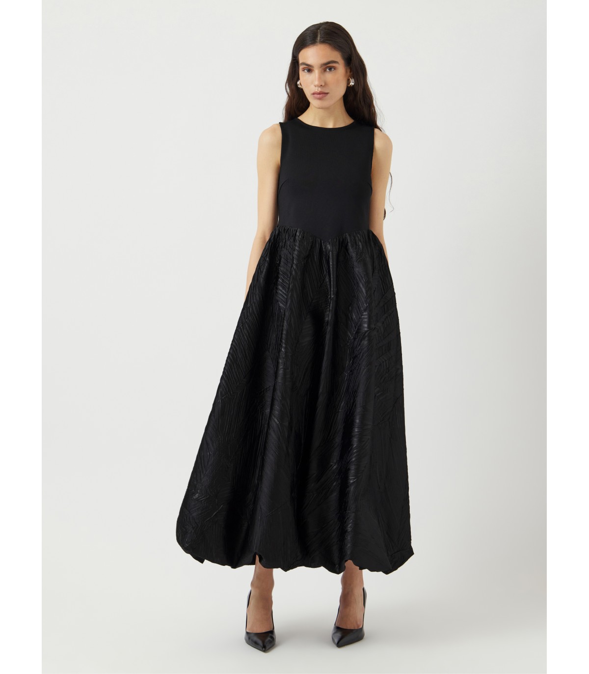 Элегантное чёрное платье с простым верхом и необычной, слегка блестящей юбкой. Платье имеет длину макси и классический крой, идеально подходящий как для официальных мероприятий, так и для вечерних посиделок. Материал красиво ложится по фигуре, создавая воздушный, но изысканный силуэт при движении.