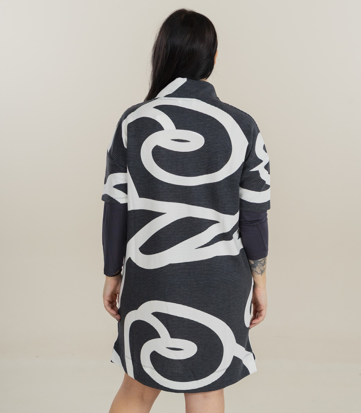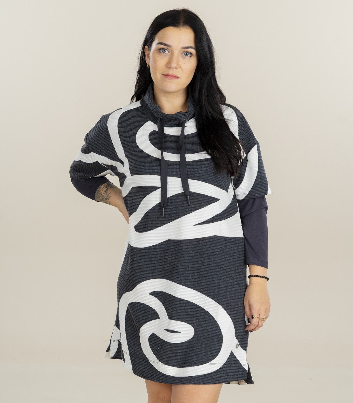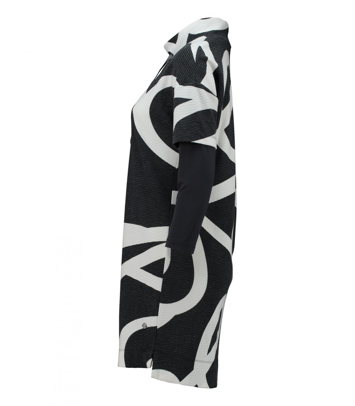 Современное и удобное платье Zabaione с эффектным узором. Платье выполнено из рельефной ткани с контрастным абстрактным узором. Модель имеет эффект многослойности: короткие рукава перекрыты длинными, создавая интересный визуальный образ. Высокий ворот горловины с регулируемой кулиской добавляет спортивный акцент.