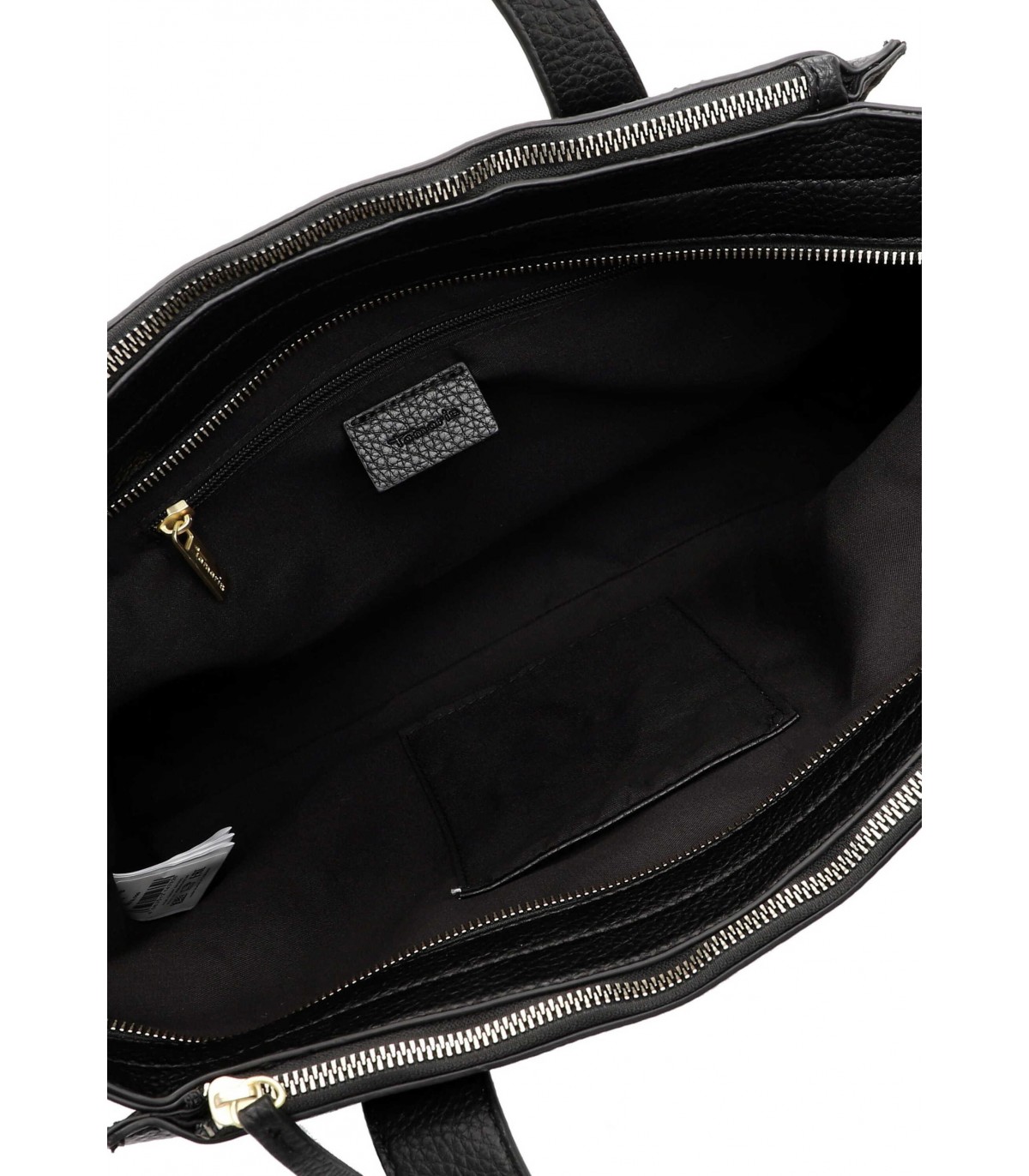 Классическая черная женская сумка идеально подходит для повседневной носки и работы. Сумка изготовлена из прочной фактурной искусственной кожи. Поверхность дополнена золотистыми металлическими деталями.