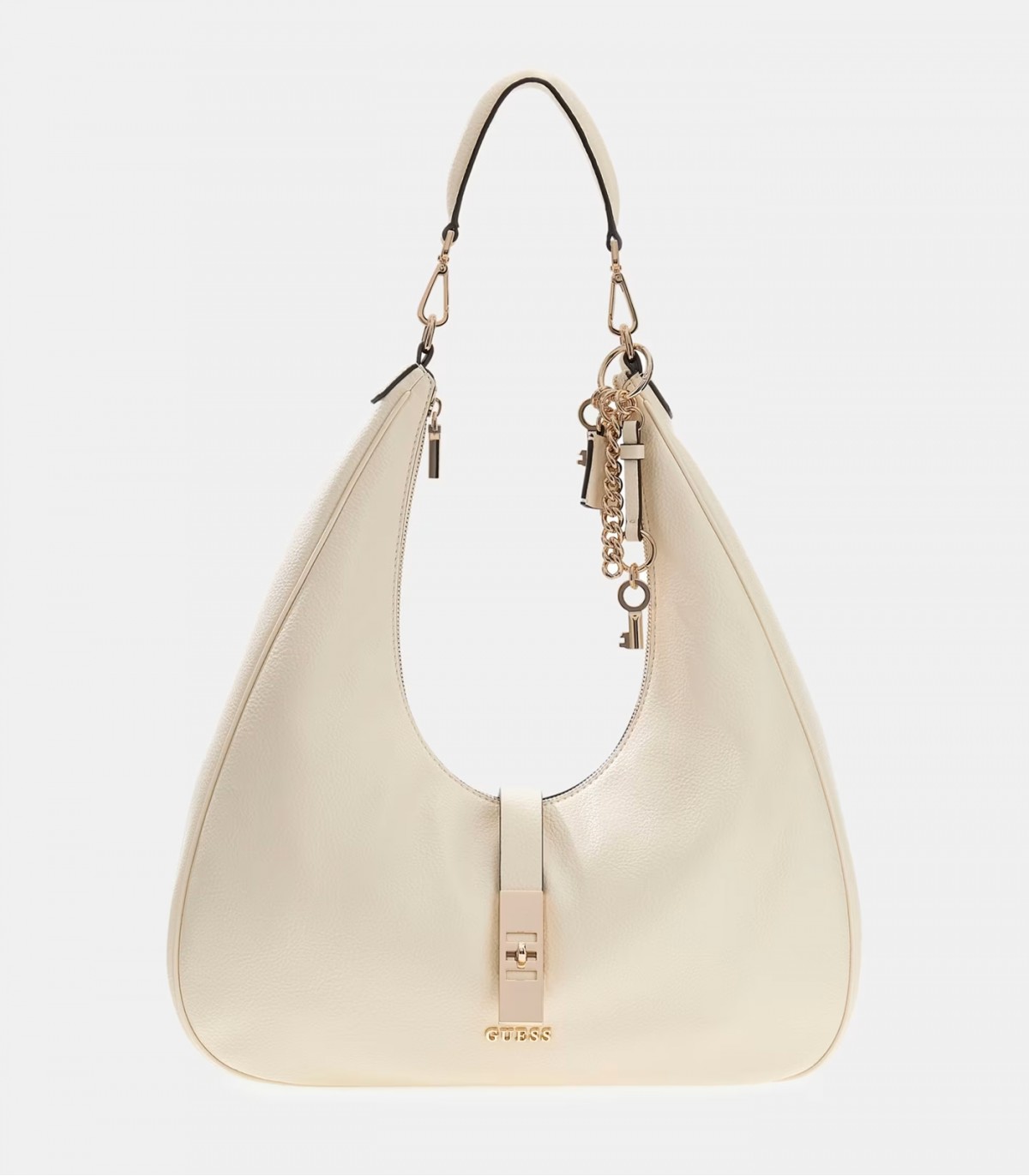 Женская сумка Guess выполнена из качественной искусственной кожи и украшена золотистой фурнитурой, что придаёт аксессуару стильный и элегантный вид. Металлические детали и съёмные подвески с логотипом подчёркивают фирменный характер модели. Внутренний и задний карманы на молнии обеспечивают удобную организацию вещей.