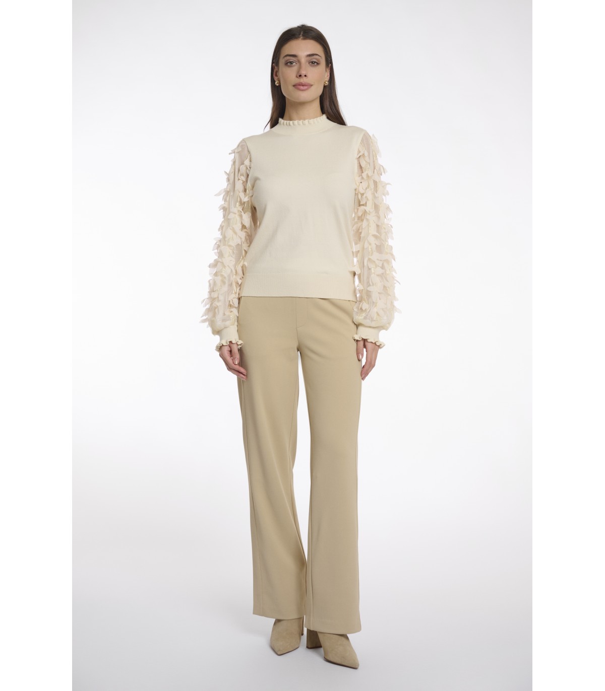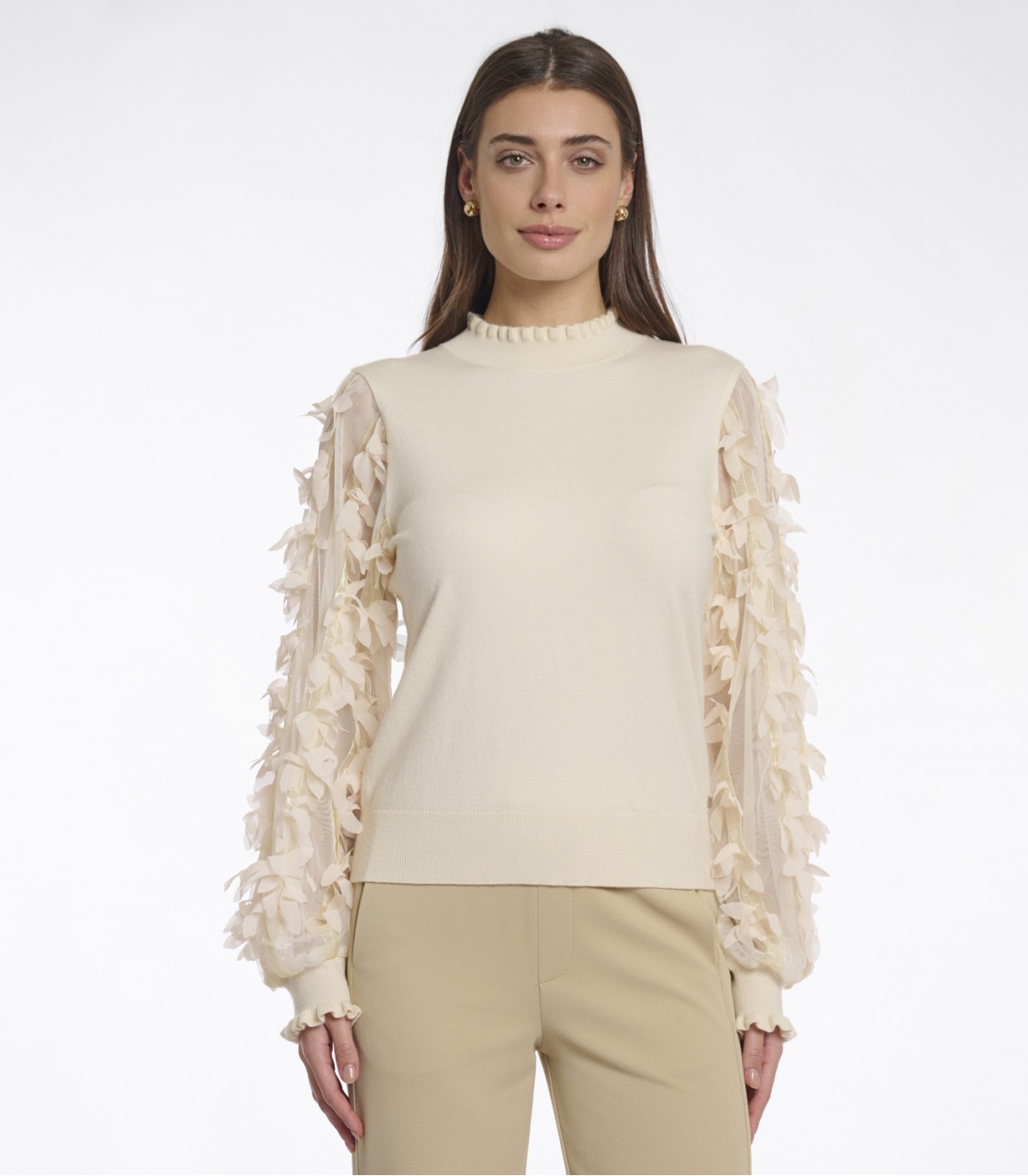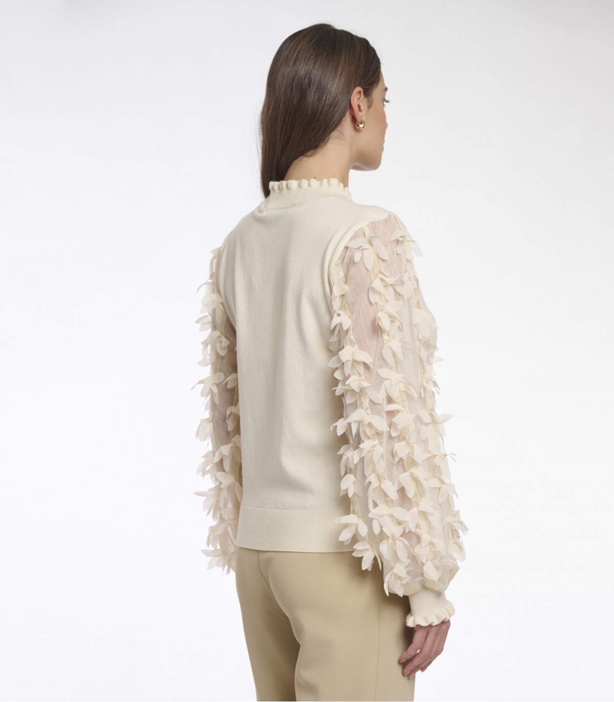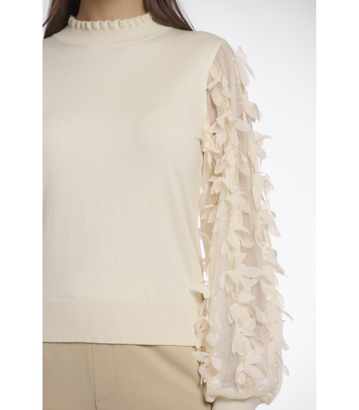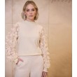 Этот свитер Romi — идеальное сочетание тепла и изящных деталей. Воздушные сетчатые рукава, искусно украшенные красивой цветочной вышивкой, придают ему нотку причудливого очарования. Круглый вырез горловины с изящными складками и трикотажные манжеты завершают образ, создавая уютный и стильный образ.