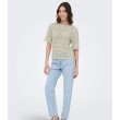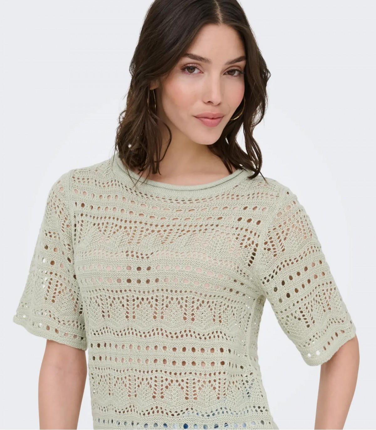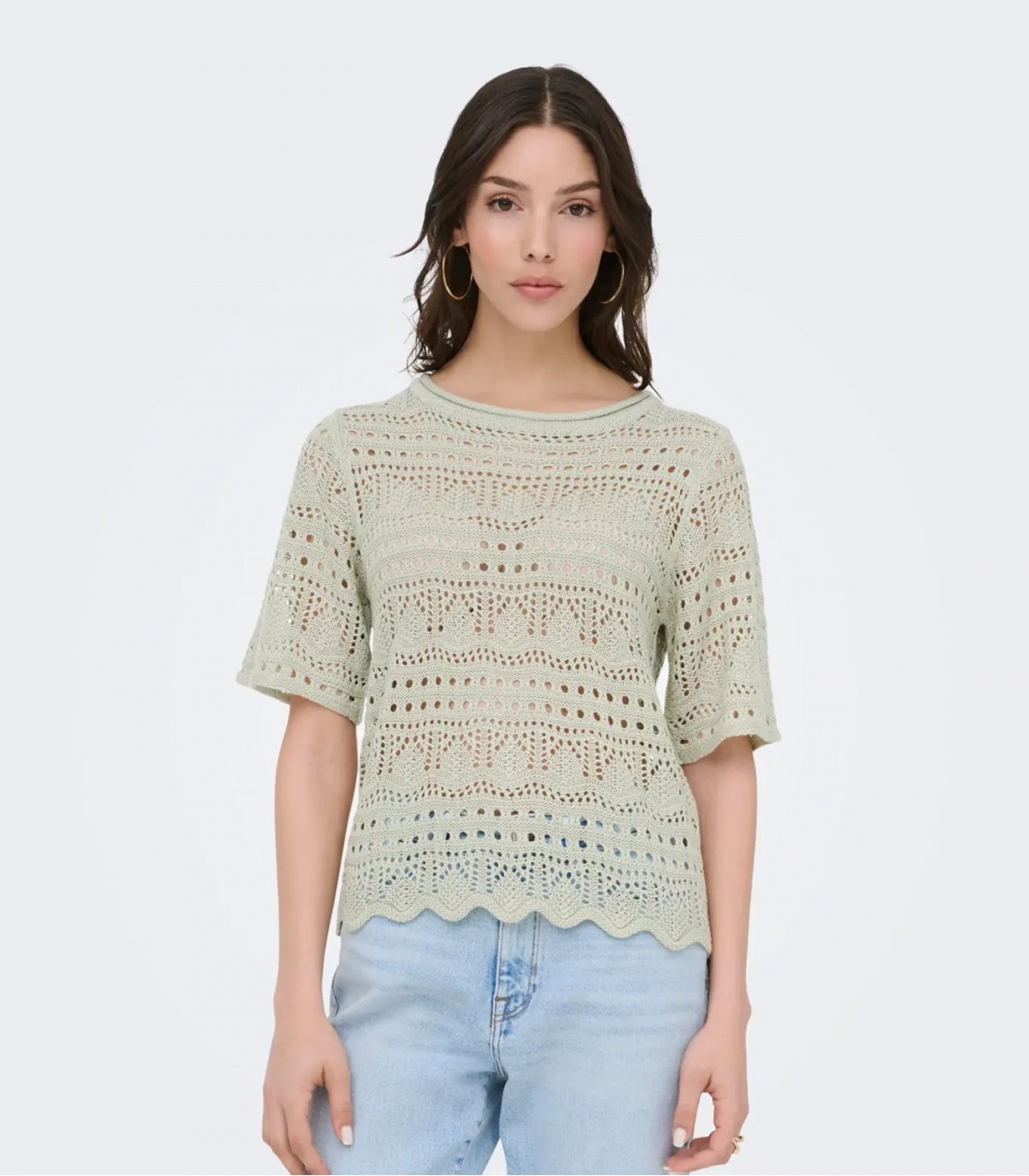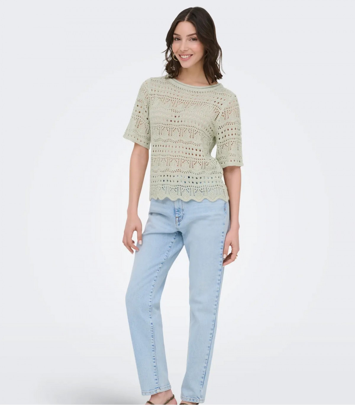 Укороченный, воздушный вязаный пуловер добавит женственности любому образу. Круглый вырез и рукава длиной 3/4 создают вневременной образ, а волнистая отделка добавляет игривости. Идеально подходит для летних дней.