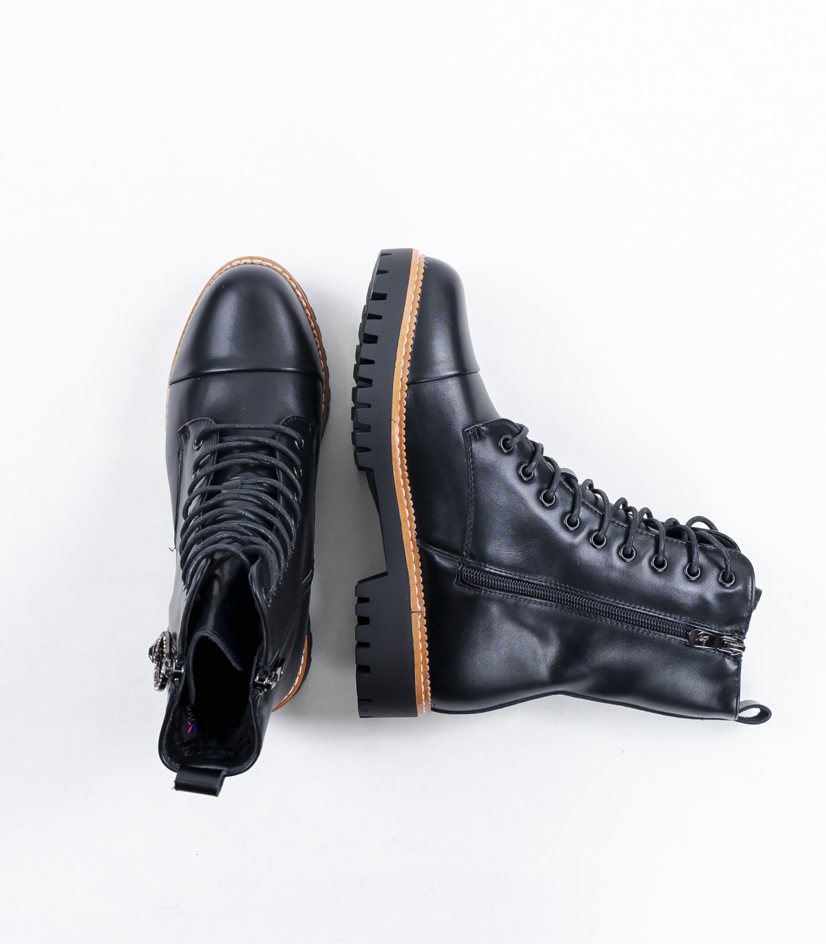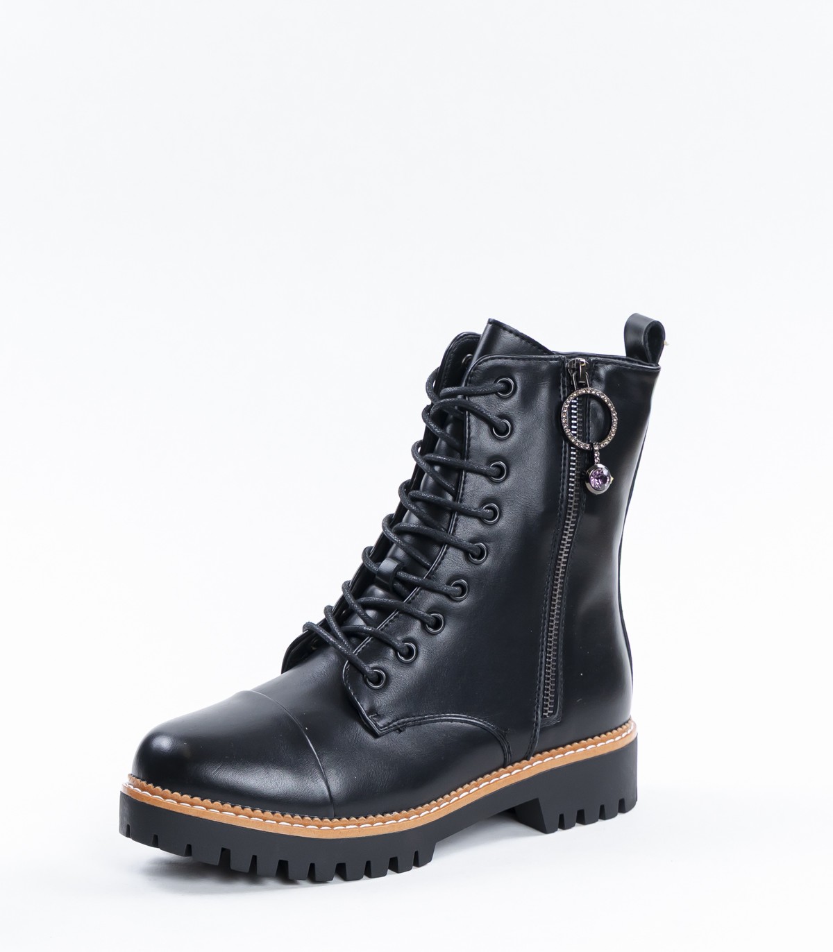 Черные женские ботинки с классической шнуровкой и боковой молнией. Прочная рельефная подошва обеспечивает надежное сцепление с землей, а теплая подкладка сохраняет ноги в тепле и комфорте даже в прохладную погоду.