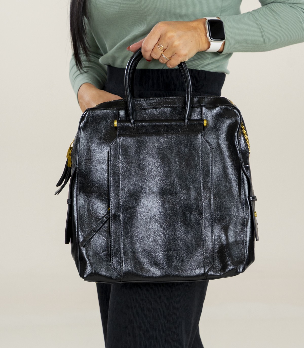 Mitmekülgne naiste seljakott läikivast mustast kunstnahast on praktiline igapäevaseks kasutamiseks, selles on piisavalt ruumi ja palju funktsionaalseid taskuid.